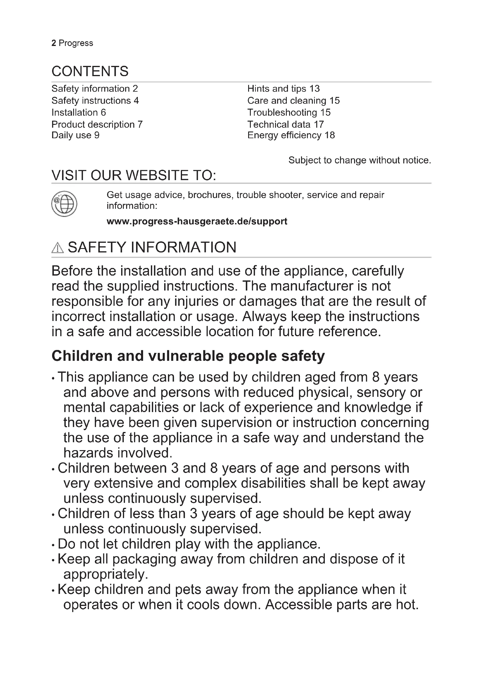 PAI6205E User Manual Notice d'utilisation Benutzerinformation Hob Table de cuisson KochfeldCONTENTS Safety information 2 Safety instructions 4 Installation 6 Product description 7 Daily use 9 Hints and tips 13 Care and cleaning 15 Troubleshooting 15 Technical data 17 Energy efficiency 18 Subject to change without notice. VISIT OUR WEBSITE TO: Get usage advice, brochures, trouble shooter, service and repair information: www.progress-hausgeraete.de/support SAFETY INFORMATION Before the installation and use of the appliance, carefully read the supplied instructions. The manufacturer is not responsible for any injuries or damages that are the result of incorrect installation or usage. Always keep the instructions in a safe and accessible location for future reference. Children and vulnerable people safety