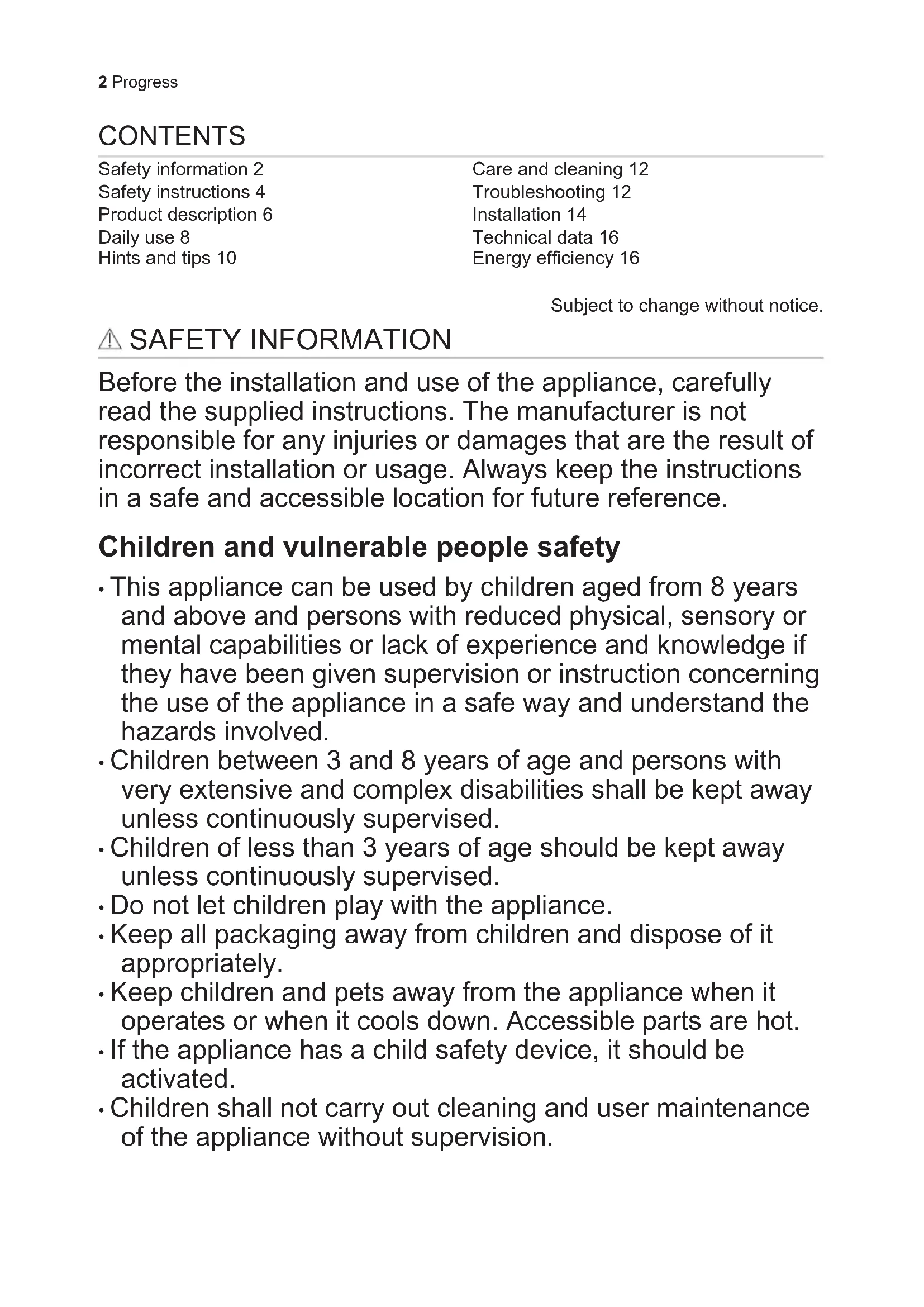 - Children shall not carry out cleaning and user maintenance of the appliance without supervision. 2 ProgressGeneral Safety