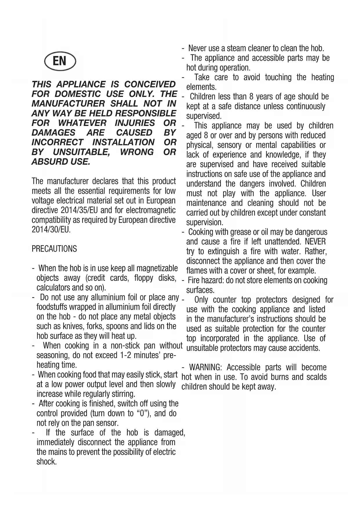 ABSURD USE. The manufacturer declares that this product meets all the essential requirements for low voltage electrical material set out in European directive 2014/35/EU and for electromagnetic compatibility as required by European directive 2014/30/EU. PRECAUTIONS - When the hob is in use keep all magnetizable objects away (credit cards, floppy disks, calculators and so on). - Do not use any alluminium foil or place any foodstuffs wrapped in alluminium foil directly on the hob - do not place any metal objects such as knives, forks, spoons and lids on the hob surface as they will heat up. - When cooking in a non-stick pan without seasoning, do not exceed 1-2 minutes’ pre- heating time. - When cooking food that may easily stick, start at a low power output level and then slowly increase while regularly stirring. - After cooking is finished, switch off using the control provided (turn down to “0”), and do not rely on the pan sensor. - If the surface of the hob is damaged, immediately disconnect the appliance from the mains to prevent the possibility of electric shock. - Never use a steam cleaner to clean the hob. - The appliance and accessible parts may be hot during operation. - Take care to avoid touching the heating elements. - Children less than 8 years of age should be kept at a safe distance unless continuously supervised. - This appliance may be used by children aged 8 or over and by persons with reduced physical, sensory or mental capabilities or lack of experience and knowledge, if they are supervised and have received suitable instructions on safe use of the appliance and understand the dangers involved. Children must not play with the appliance. User maintenance and cleaning should not be carried out by children except under constant supervision. - Cooking with grease or oil may be dangerous and cause a fire if left unattended. NEVER try to extinguish a fire with water. Rather, disconnect the appliance and then cover the flames with a cover or sheet, for example. - Fire hazard: do not store elements on cooking surfaces. - Only counter top protectors designed for use with the cooking appliance and listed in the manufacturer’s instructions should be used as suitable protection for the counter top incorporated in the appliance. Use of unsuitable protectors may cause accidents. - WARNING: Accessible parts will become hot when in use. To avoid burns and scalds children should be kept away. ENInsert in the fixed wiring a mean for disconnection from the supply mains having a contact separation in all poles that provide full disconnection under overvoltage category III conditions, in accordance with the wiring rules. The plug or omnipolar switch must be easily reached on the installed equipment. This appliance is not intended to be used via an external timer or a remote control system. The manufacturers decline any responsibility in the event of non-compliance with what is described above and the accident prevention norms not being respected and followed. To avoid all risk, if the power cable becomes damaged, it must only be replaced by the manufacturer, by an authorised service centre, or by a qualified electrician. OPERATING PRINCIPLE (Fig. 1) It exploits the electromagnetic properties of most cooking vessels. The coil (inductor) which produces the electromagnetic field is operated and controlled by the electronic circuit. The heat is transmitted to food by the cooking vessel itself. The cooking process takes place as described below. - loss of heat is minimum (high efficiency) - the system stops automatically when the vessel is removed or even just lifted from the hob - the electronic circuit guarantees maximum flexibility and fine adjustments. (Fig. 1) 1 Vessel 2 Induced current 3 Magnetic field 4 Inductor 5 Electronic circuit 6 Power supply User’s Instructions (Fig. 2) 1 Power ON / Power OFF 2 Slider sensor 3 Power key 4 Lock key