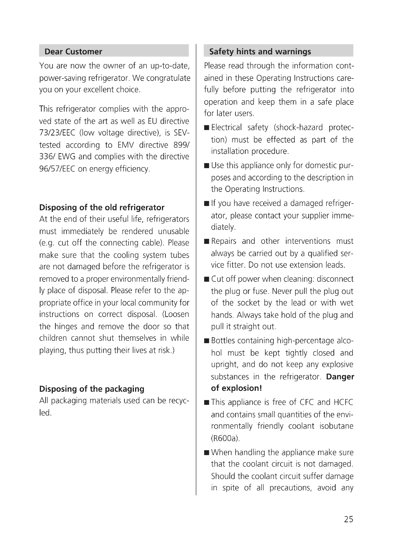 Umbruch_IK513-032.qxd 24.11.2006 9:58 Uhr Seite 2324 Contents Operating Instructions 25 Introduction 25 Safety hints and warnings 26 Switching on and temperature selection 27 Freezing 27 Variable inside door 28 Cooling zone 28 Bottle drawer 28 Defrosting 29 Cleaning 29 Tips 30 Replacing light bulb 30 Malfunctions 30 Guarantee 32 Operating noises 33 Installation / Dimensions Installation See Assembly Instructions in Installation Pack Umbruch_IK513-032.qxd 24.11.2006 9:58 Uhr Seite 2425 Dear Customer You are now the owner of an up-to-date, power-saving refrigerator. We congratulate you on your excellent choice. This refrigerator complies with the appro- ved state of the art as well as EU directive 73/23/EEC (low voltage directive), is SEV- tested according to EMV directive 899/ 336/ EWG and complies with the directive 96/57/EEC on energy efficiency. Disposing of the old refrigerator At the end of their useful life, refrigerators must immediately be rendered unusable (e.g. cut off the connecting cable). Please make sure that the cooling system tubes are not damaged before the refrigerator is removed to a proper environmentally friend- ly place of disposal. Please refer to the ap- propriate office in your local community for instructions on correct disposal. (Loosen the hinges and remove the door so that children cannot shut themselves in while playing, thus putting their lives at risk.) Disposing of the packaging All packaging materials used can be recyc- led. Safety hints and warnings Please read through the information cont- ained in these Operating Instructions care- fully before putting the refrigerator into operation and keep them in a safe place for later users. ■ Electrical safety (shock-hazard protec- tion) must be effected as part of the installation procedure. ■ Use this appliance only for domestic pur- poses and according to the description in the Operating Instructions. ■ If you have received a damaged refriger- ator, please contact your supplier imme- diately. ■ Repairs and other interventions must always be carried out by a qualified ser- vice fitter. Do not use extension leads. ■ Cut off power when cleaning: disconnect the plug or fuse. Never pull the plug out of the socket by the lead or with wet hands. Always take hold of the plug and pull it straight out. ■ Bottles containing high-percentage alco- hol must be kept tightly closed and upright, and do not keep any explosive substances in the refrigerator. Danger of explosion! ■ This appliance is free of CFC and HCFC and contains small quantities of the envi- ronmentally friendly coolant isobutane (R600a). ■ When handling the appliance make sure that the coolant circuit is not damaged. Should the coolant circuit suffer damage in spite of all precautions, avoid any Umbruch_IK513-032.qxd 24.11.2006 9:58 Uhr Seite 2526 naked light or ignition source of any kind. Ventilate the room in which the appliance is standing for several minutes. ■ An appliance with a damaged coolant circuit must not be put into operation. ■ When installed, make sure that the ven- tilation openings are not covered or blocked, ■ No mechanical or artificial means other than those recommended must be used to accelerate defrosting. ■ No liability is accepted for any damage if the appliance is used for any purpose other than that intended, if it is impro- perly operated or repaired by an unqua- lified person. In this case, the guarantee lapses and any other liability claims are null and void. ■ If the connecting lead of this appliance is damaged, it must be replaced by the manufacturer or the manufacturer's after- sales service or a similarly qualified person, in order to avoid any risk. ■ Warning: do not operate any electrical appliance inside the food storage area. Switching on and temperature selection (Fig. @) The temperature regulator is used to set the cooling level and to switch the refriger- ator on and off. Important: The appliance is designed to be operated at an ambient temperature of between 10 – 38° C. If the ambient temperature is outside this range, there is no guarantee that the inside temperature in the cooling zone and deep-freeze compartment will be maintained. Normal: Position between 5 –7 The minimum temperature in the deep-freeze compartment remains at 18° C when the temperature in the main cooling zone is +5° C or less. Low ambient temperature With ambient temperatures below +15° C the temperature in the deep-freeze can be kept at –18° C by pressing the red flip switch (switch light "ON"). This is neces- sary to prolong short operating cycles of the compressor. With ambient temperatu- res of 16° C or more, leave the switch in normal position (switch light "OFF"). Off: Position 0 Refrigeration and light are swit- ched off. If left off for a long peri- od, leave both doors open to pre- vent odours forming.