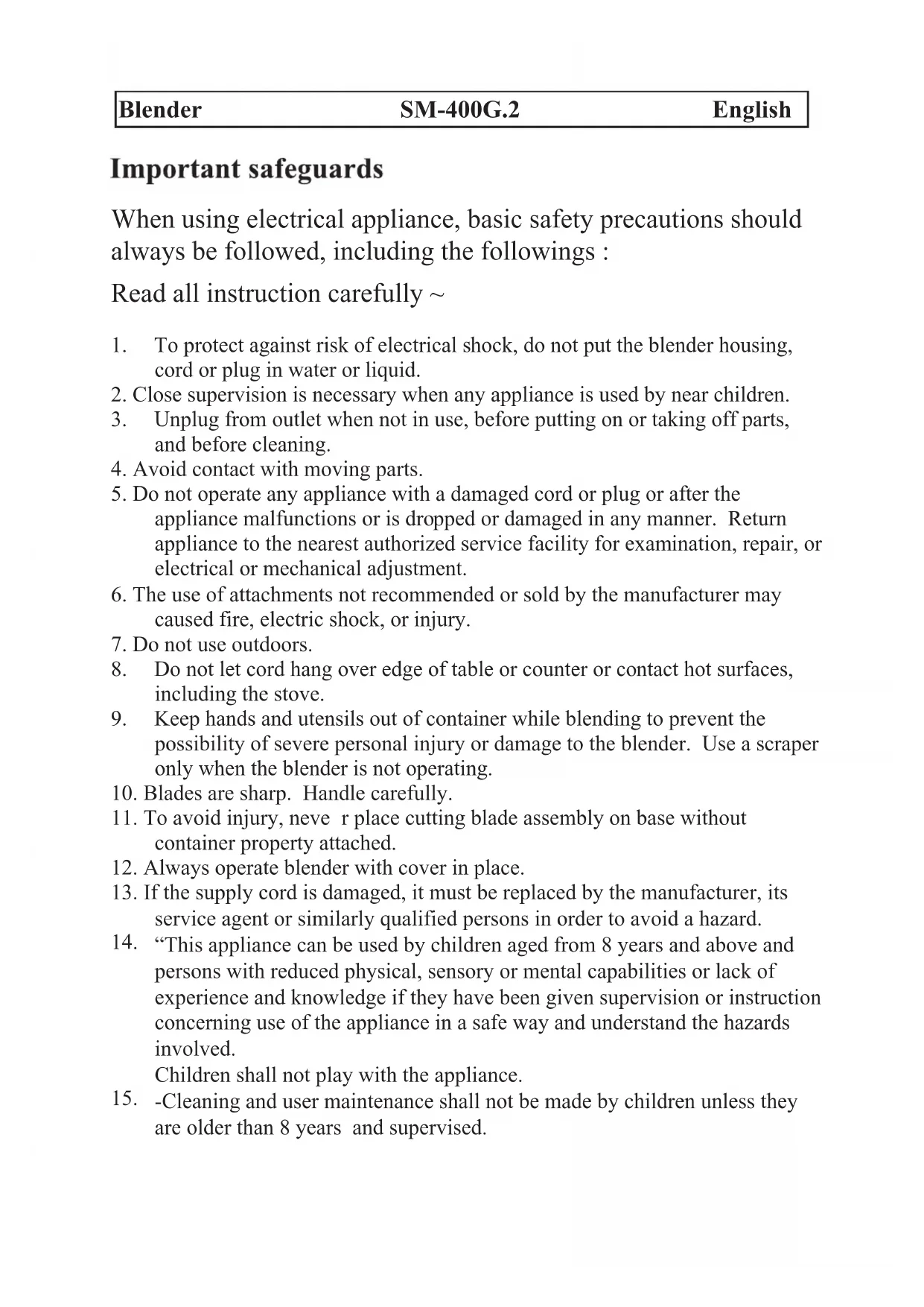 “Auto Clean” “4”“3”“2”“1” or “0” Keep the appliance and its cord out of reach of children less than 8 years.” The appliance is not intended to be operated by means of an external timer or separate remote-control system. The appliance is for indoor use only.Technical data Power : 400W Max Voltage : 220-240V~50Hz Maximum capacity ( jug ) : 1500ml