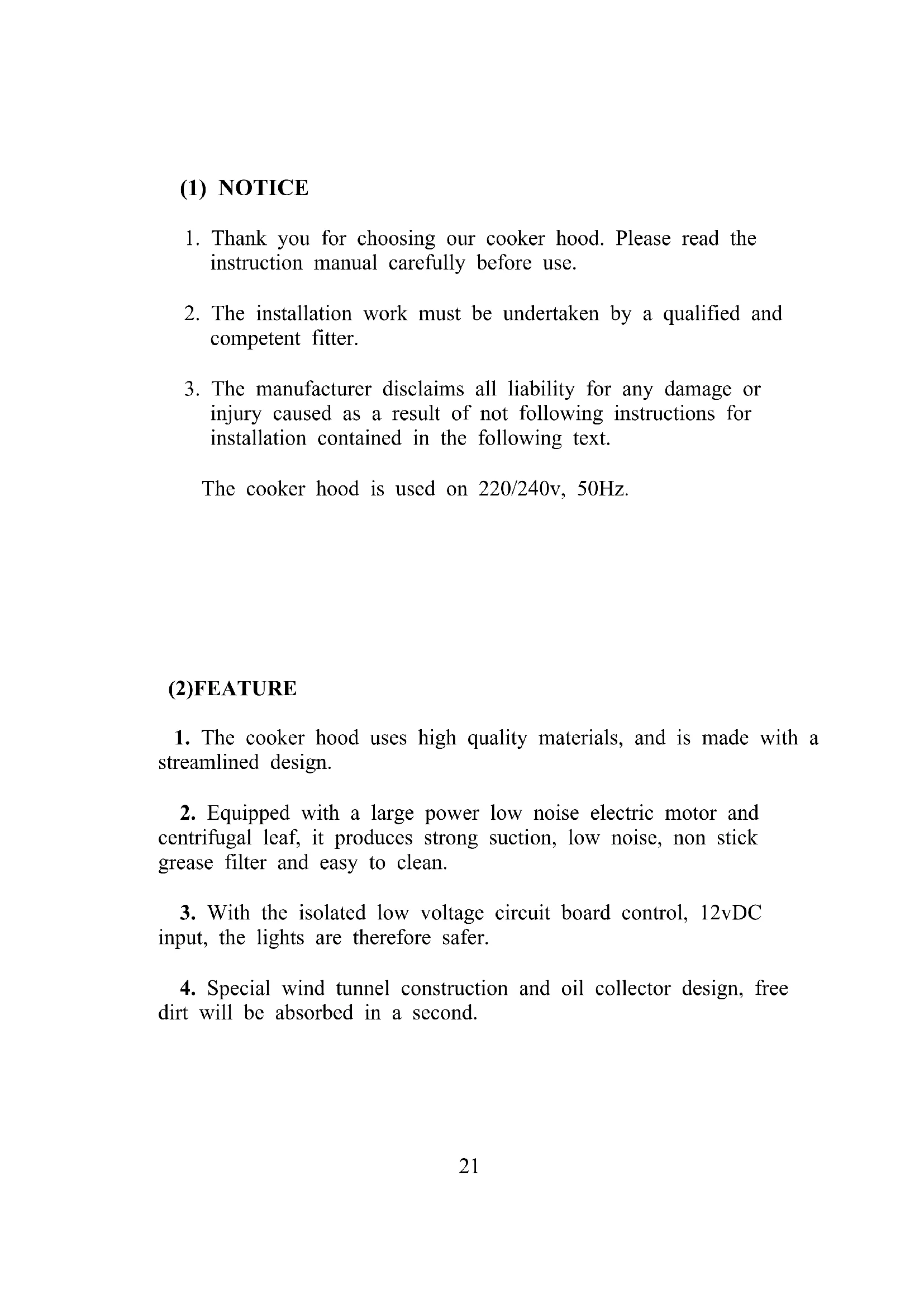 injury caused as a result of not following instructions for installation contained in the following text. The cooker hood is used on 220/240v, 50Hz. (2)FEATURE