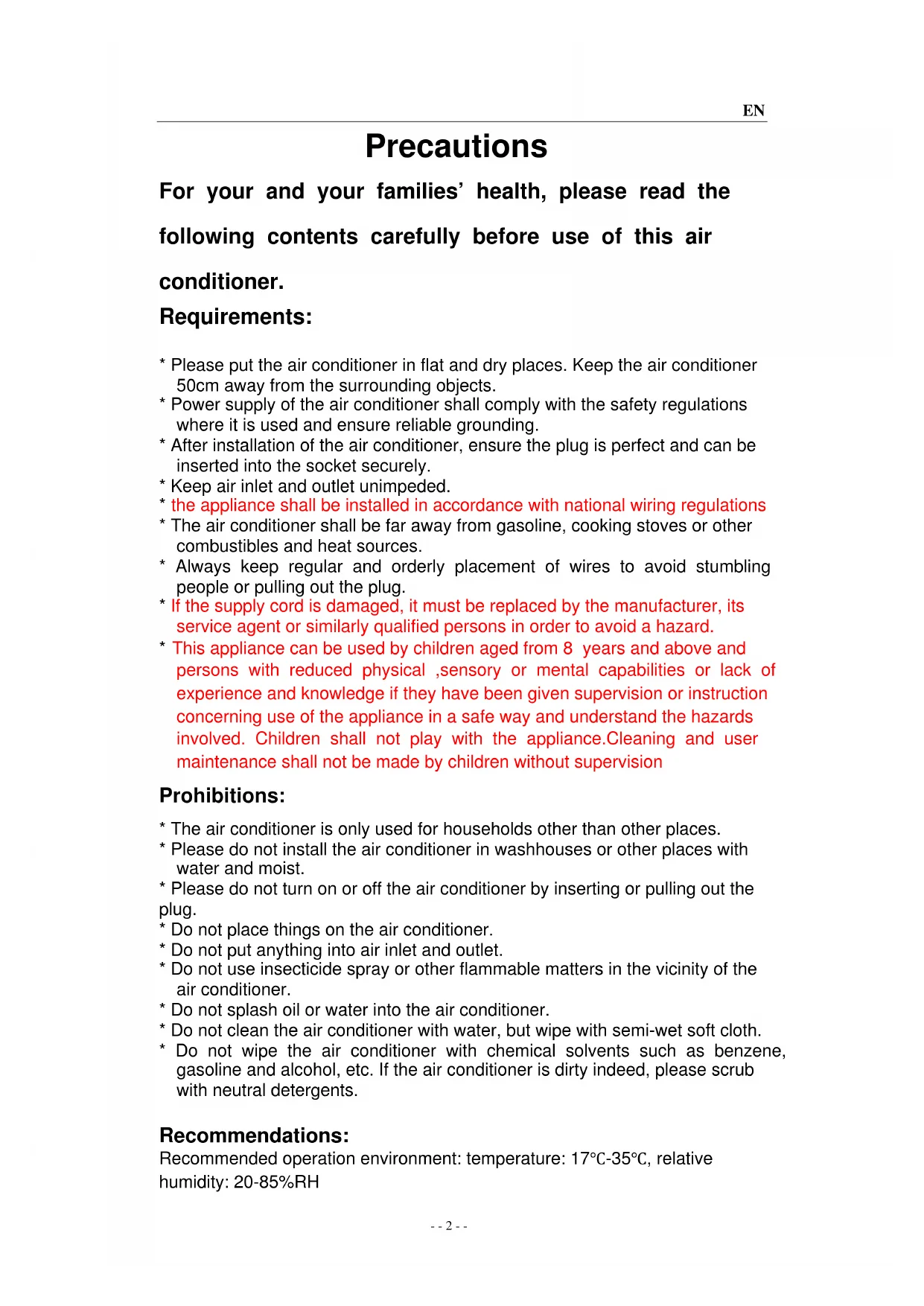 - The air conditioner shall be far away from gasoline, cooking stoves or other combustibles and heat sources.