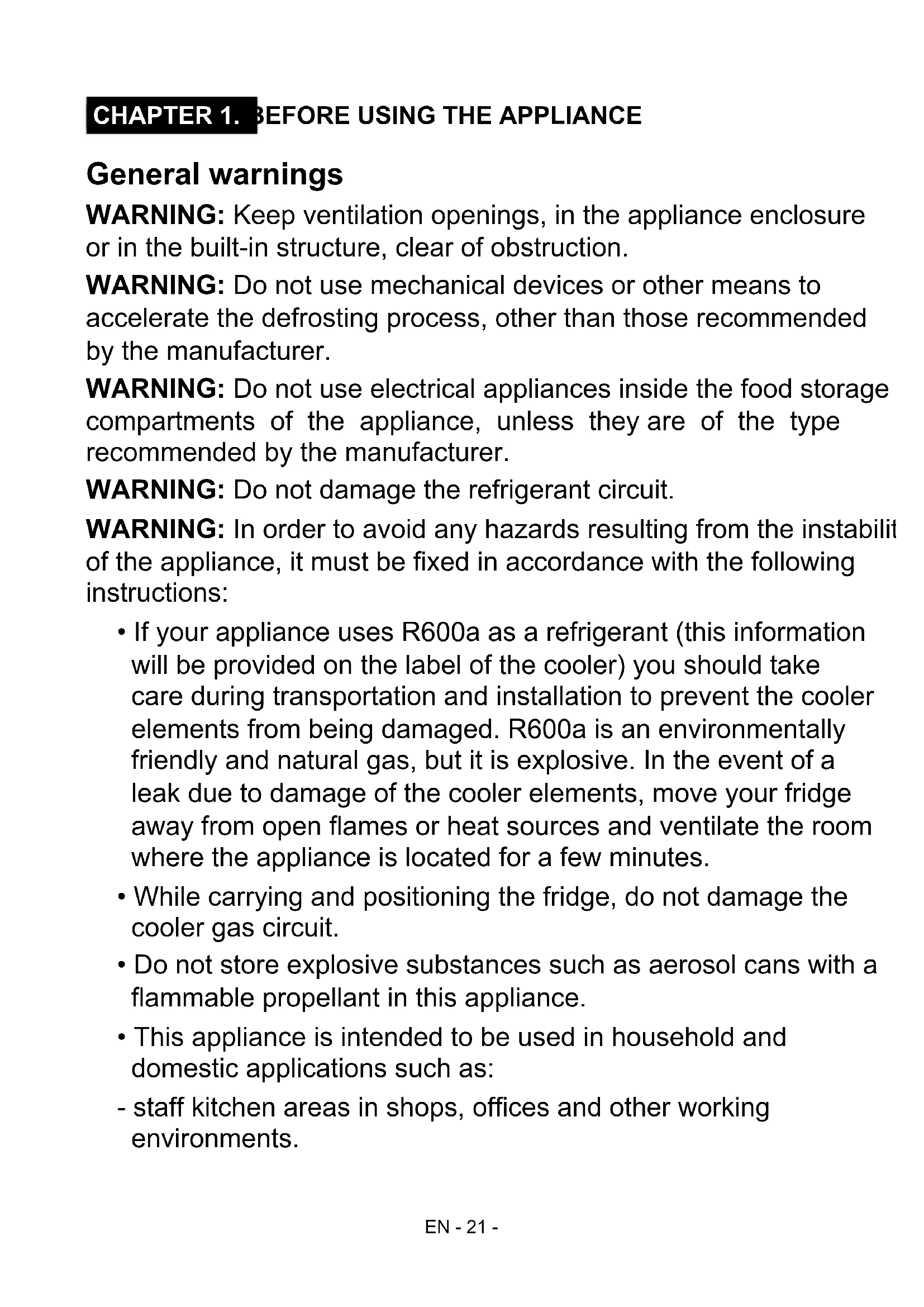 - If your appliance uses R600a as a refrigerant (this information will be provided on the label of the cooler) you should take care during transportation and installation to prevent the cooler elements from being damaged. R600a is an environmentally friendly and natural gas, but it is explosive. In the event of a leak due to damage of the cooler elements, move your fridge away from open flames or heat sources and ventilate the room where the appliance is located for a few minutes.