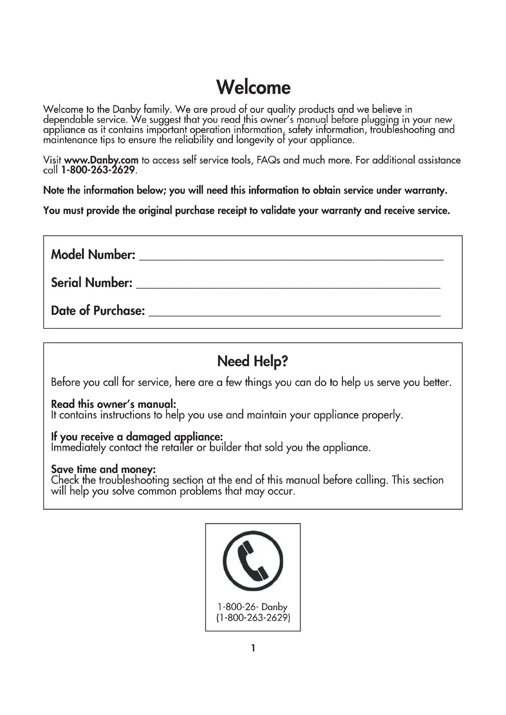 DAC120B5WDB-6Welcome Welcome to the Danby family. We are proud of our quality products and we believe in dependable service. We suggest that you read this owner’s manual before plugging in your new appliance as it contains important operation information, safety information, troubleshooting and maintenance tips to ensure the reliability and longevity of your appliance. Visit www.Danby.com to access self service tools, FAQs and much more. For additional assistance call 1-800-263-2629. Note the information below; you will need this information to obtain service under warranty. You must provide the original purchase receipt to validate your warranty and receive service. Model Number: _________________________________________________ Serial Number: _________________________________________________ Date of Purchase: _______________________________________________ Need Help? Before you call for service, here are a few things you can do to help us serve you better. Read this owner’s manual: It contains instructions to help you use and maintain your appliance properly. If you receive a damaged appliance: Immediately contact the retailer or builder that sold you the appliance. Save time and money: Check the troubleshooting section at the end of this manual before calling. This section will help you solve common problems that may occur. 1-800-26- Danby(1-800-263-2629)