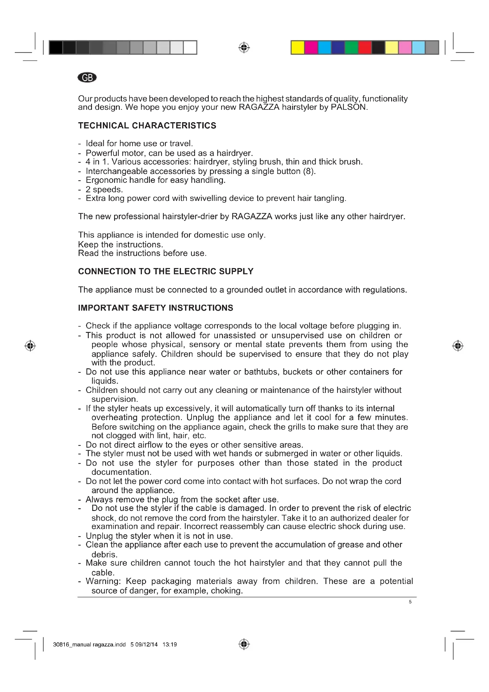 Our products have been developed to reach the highest standards of quality, functionality and design. We hope you enjoy your new RAGAZZA hairstyler by PALSON.