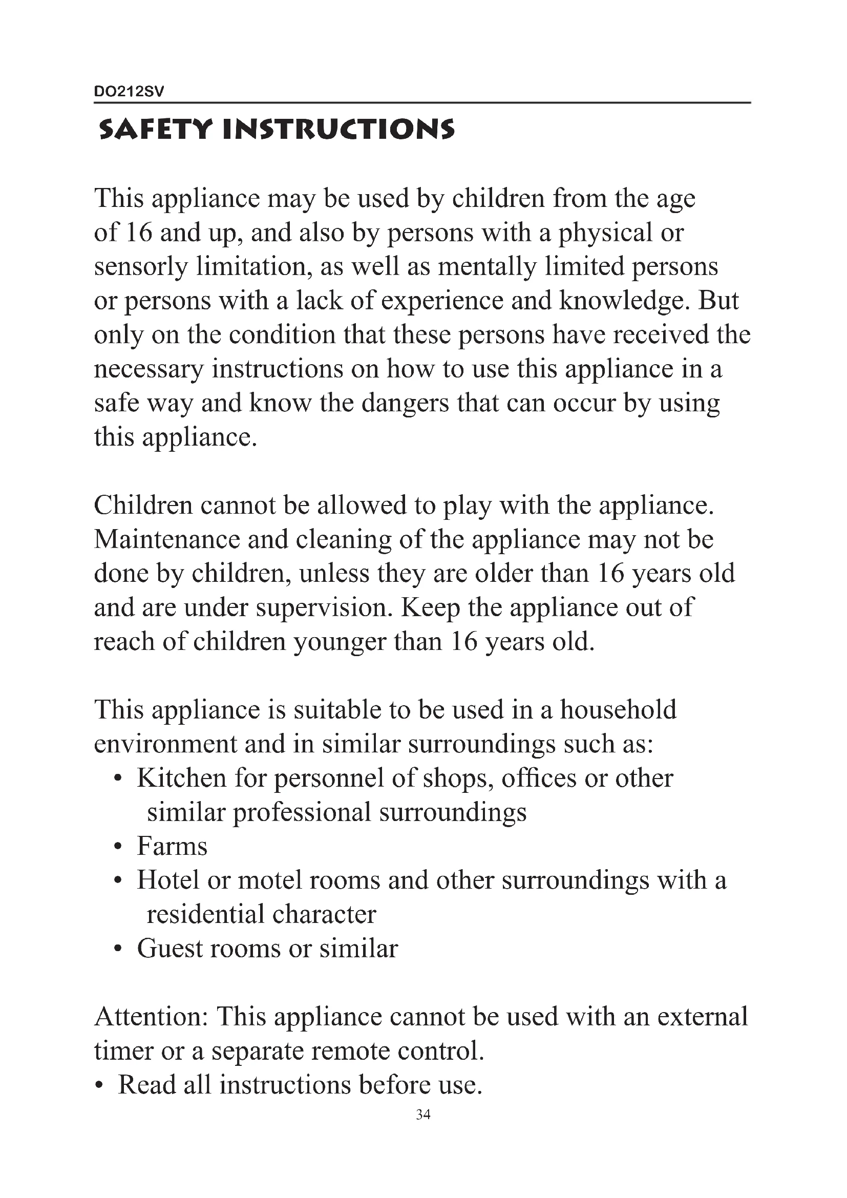 SAFETY INSTRUCTIONS This appliance may be used by children from the age of 16 and up, and also by persons with a physical or sensorly limitation, as well as mentally limited persons or persons with a lack of experience and knowledge. But only on the condition that these persons have received the necessary instructions on how to use this appliance in a safe way and know the dangers that can occur by using this appliance. Children cannot be allowed to play with the appliance. Maintenance and cleaning of the appliance may not be done by children, unless they are older than 16 years old and are under supervision. Keep the appliance out of reach of children younger than 16 years old. This appliance is suitable to be used in a household environment and in similar surroundings such as: