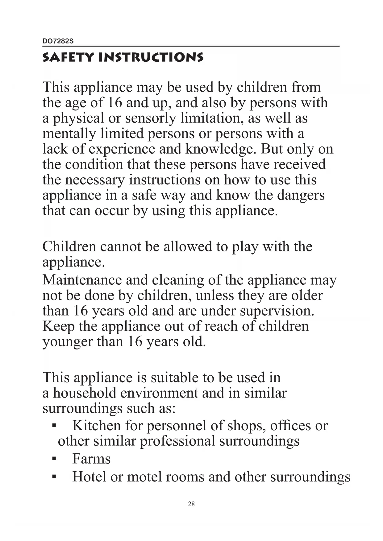 - The appliance is not intended for use by persons (including children) with reduced physical, sensory or mental capabilities,DO7282S