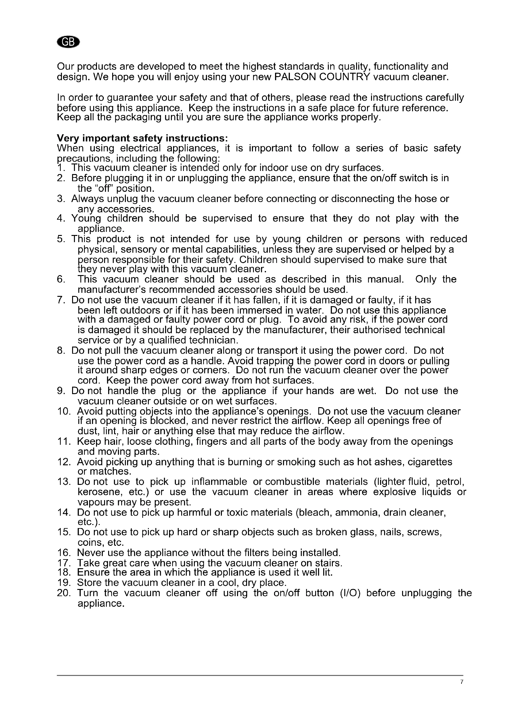 Our products are developed to meet the highest standards in quality, functionality and design. We hope you will enjoy using your new PALSON COUNTRY vacuum cleaner.