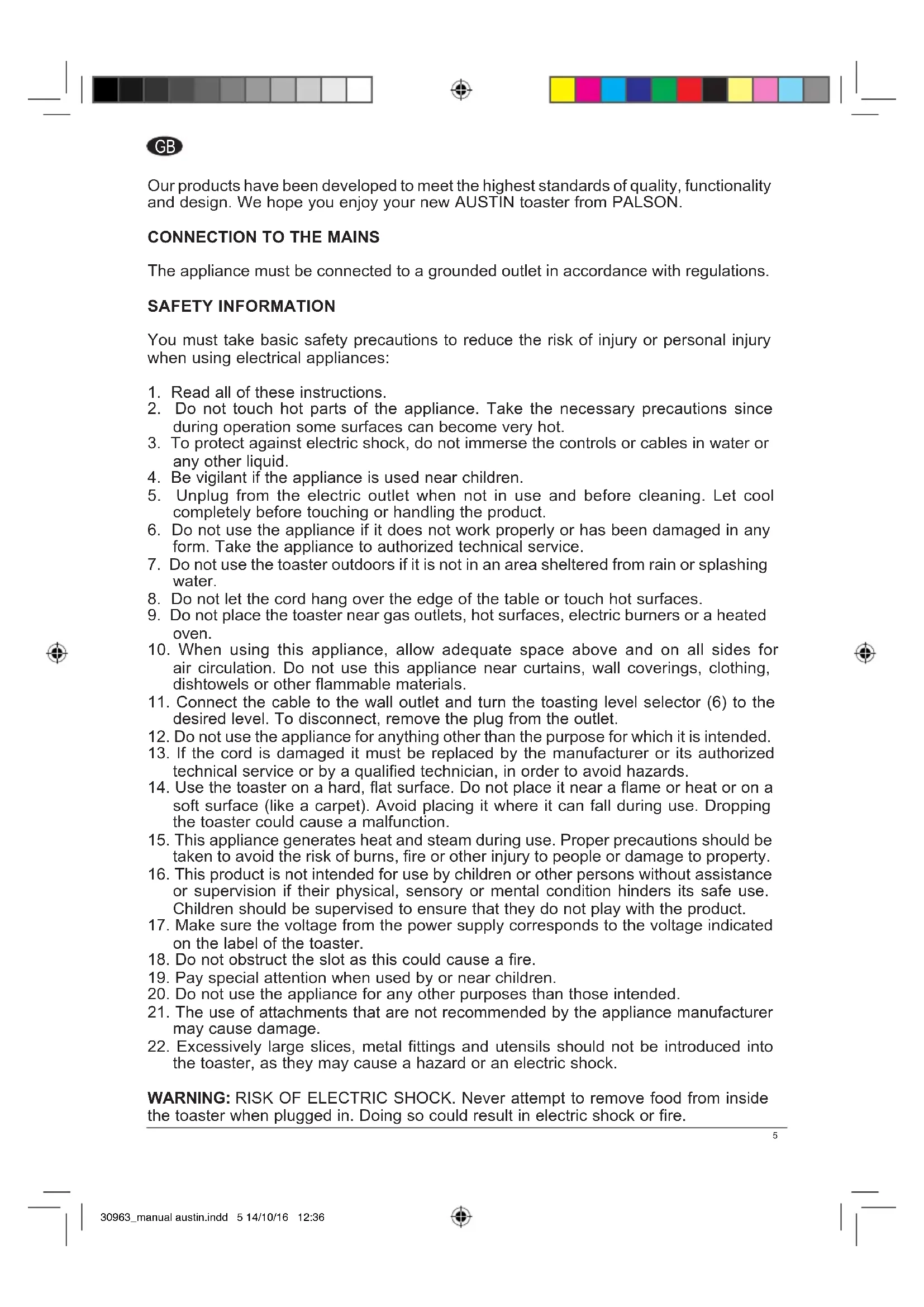 Download the instructions for your Toaster in PDF format for free! Find your manual Austin - PALSON and take your electronic device back in hand. On this page are published all the documents necessary for the use of your device. Austin by PALSON.