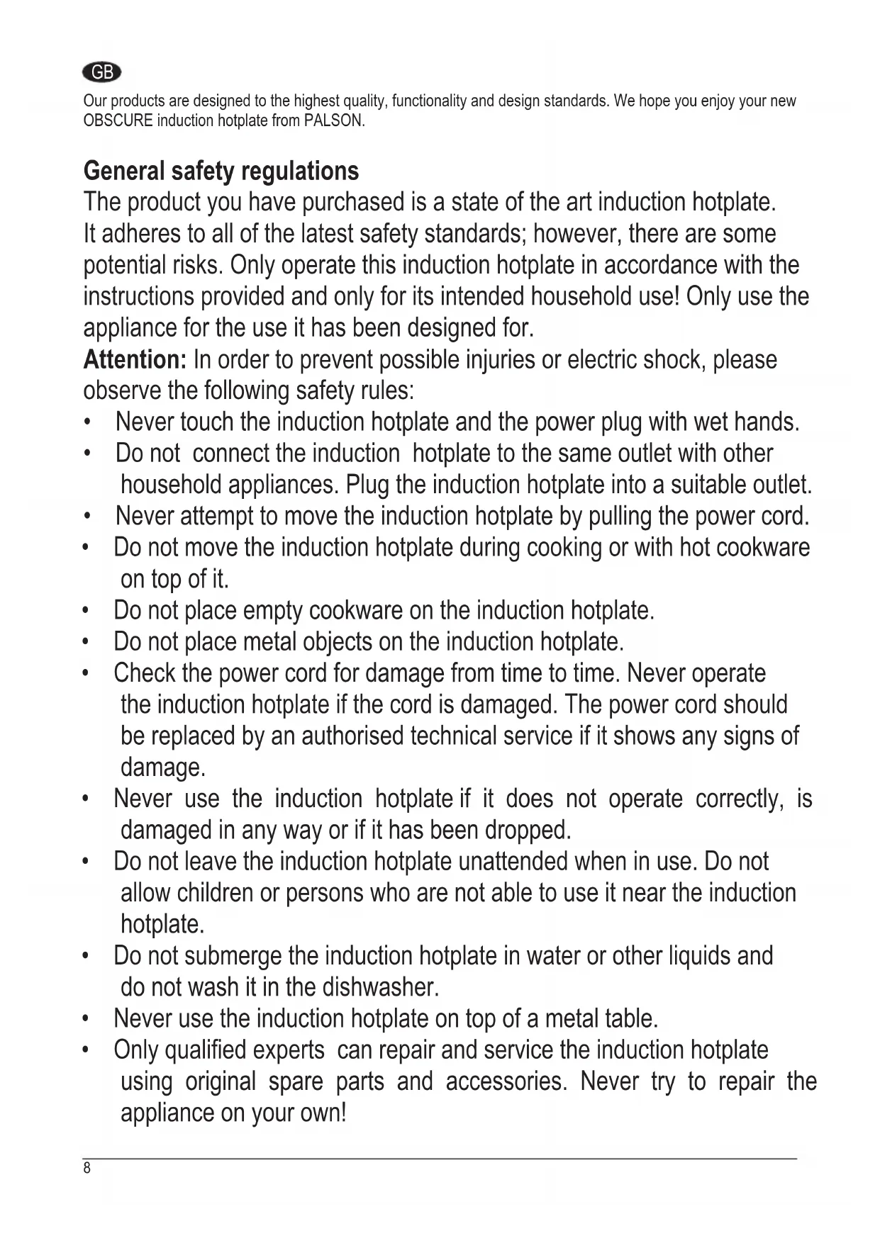Our products are designed to the highest quality, functionality and design standards. We hope you enjoy your new OBSCURE induction hotplate from PALSON.