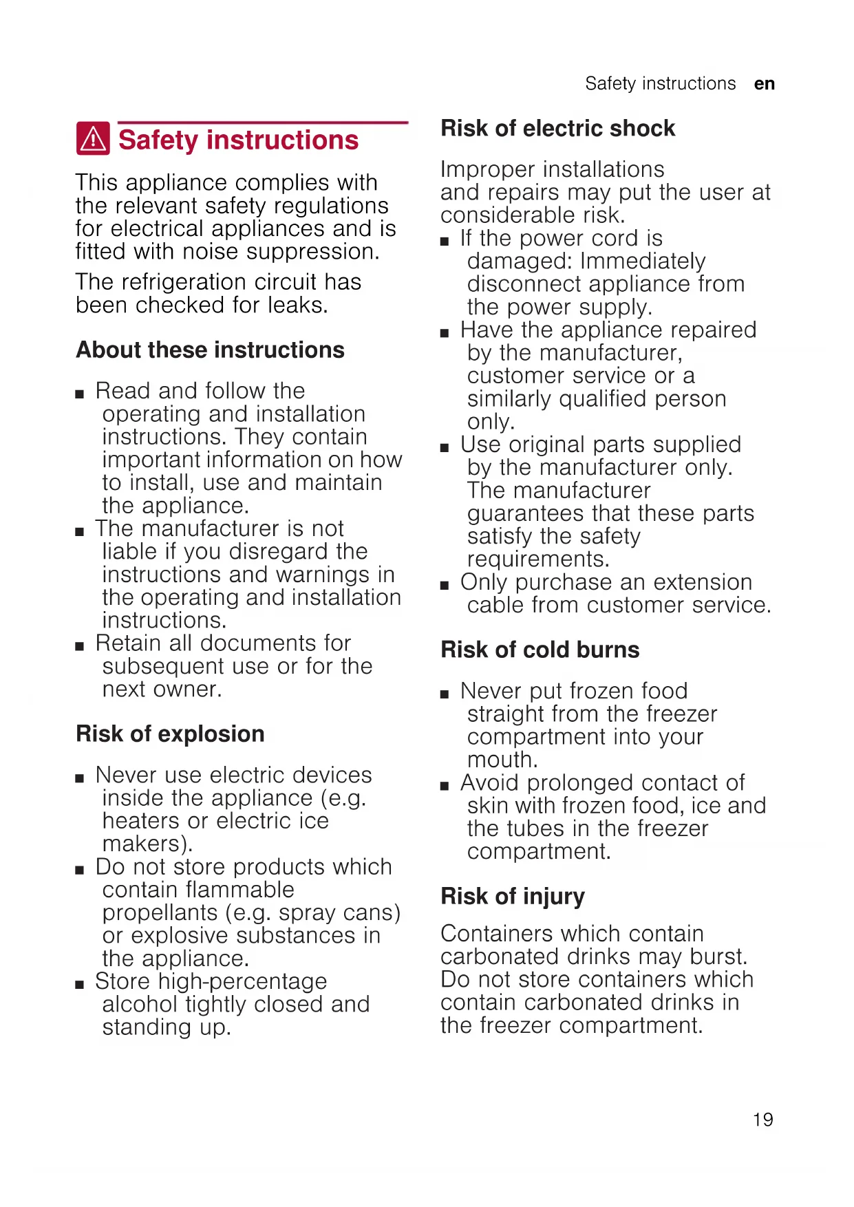 ( Safety instructions Safety instructions This appliance complies with the relevant safety regulations for electrical appliances and is fitted with noise suppression. The refrigeration circuit has been checked for leaks. About these instructions ■ Read and follow the operating and installation instructions. They contain important information on how to install, use and maintain the appliance. ■ The manufacturer is not liable if you disregard the instructions and warnings in the operating and installation instructions. ■ Retain all documents for subsequent use or for the next owner. Risk of explosion ■ Never use electric devices inside the appliance (e.g. heaters or electric ice makers). ■ Do not store products which contain flammable propellants (e.g. spray cans) or explosive substances in the appliance. ■ Store high-percentage alcohol tightly closed and standing up. Risk of electric shock Improper installations and repairs may put the user at considerable risk. ■ If the power cord is damaged: Immediately disconnect appliance from the power supply. ■ Have the appliance repaired by the manufacturer, customer service or a similarly qualified person only. ■ Use original parts supplied by the manufacturer only. The manufacturer guarantees that these parts satisfy the safety requirements. ■ Only purchase an extension cable from customer service. Risk of cold burns ■ Never put frozen food straight from the freezer compartment into your mouth. ■ Avoid prolonged contact of skin with frozen food, ice and the tubes in the freezer compartment. Risk of injury Containers which contain carbonated drinks may burst. Do not store containers which contain carbonated drinks in the freezer compartment.en Safety instructions