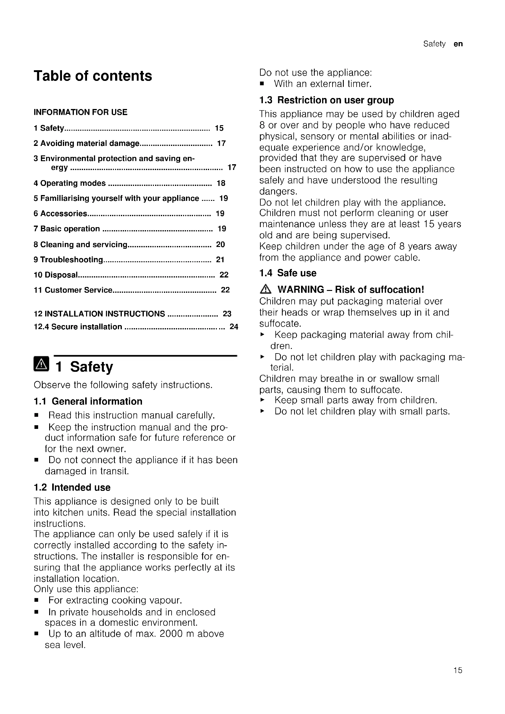 1 Safety Observe the following safety instructions. 1.1 General information ¡ Read this instruction manual carefully. ¡ Keep the instruction manual and the pro- duct information safe for future reference or for the next owner. ¡ Do not connect the appliance if it has been damaged in transit. 1.2 Intended use This appliance is designed only to be built into kitchen units. Read the special installation instructions. The appliance can only be used safely if it is correctly installed according to the safety in- structions. The installer is responsible for en- suring that the appliance works perfectly at its installation location. Only use this appliance: ¡ For extracting cooking vapour. ¡ In private households and in enclosed spaces in a domestic environment. ¡ Up to an altitude of max. 2000m above sea level. Do not use the appliance: ¡ With an external timer. 1.3 Restriction on user group This appliance may be used by children aged 8 or over and by people who have reduced physical, sensory or mental abilities or inad- equate experience and/or knowledge, provided that they are supervised or have been instructed on how to use the appliance safely and have understood the resulting dangers. Do not let children play with the appliance. Children must not perform cleaning or user maintenance unless they are at least 15 years old and are being supervised. Keep children under the age of 8 years away from the appliance and power cable. 1.4 Safe use WARNING‒Risk of suffocation! Children may put packaging material over their heads or wrap themselves up in it and suffocate. ▶ Keep packaging material away from chil- dren. ▶ Do not let children play with packaging ma- terial. Children may breathe in or swallow small parts, causing them to suffocate. ▶ Keep small parts away from children. ▶ Do not let children play with small parts.en Safety