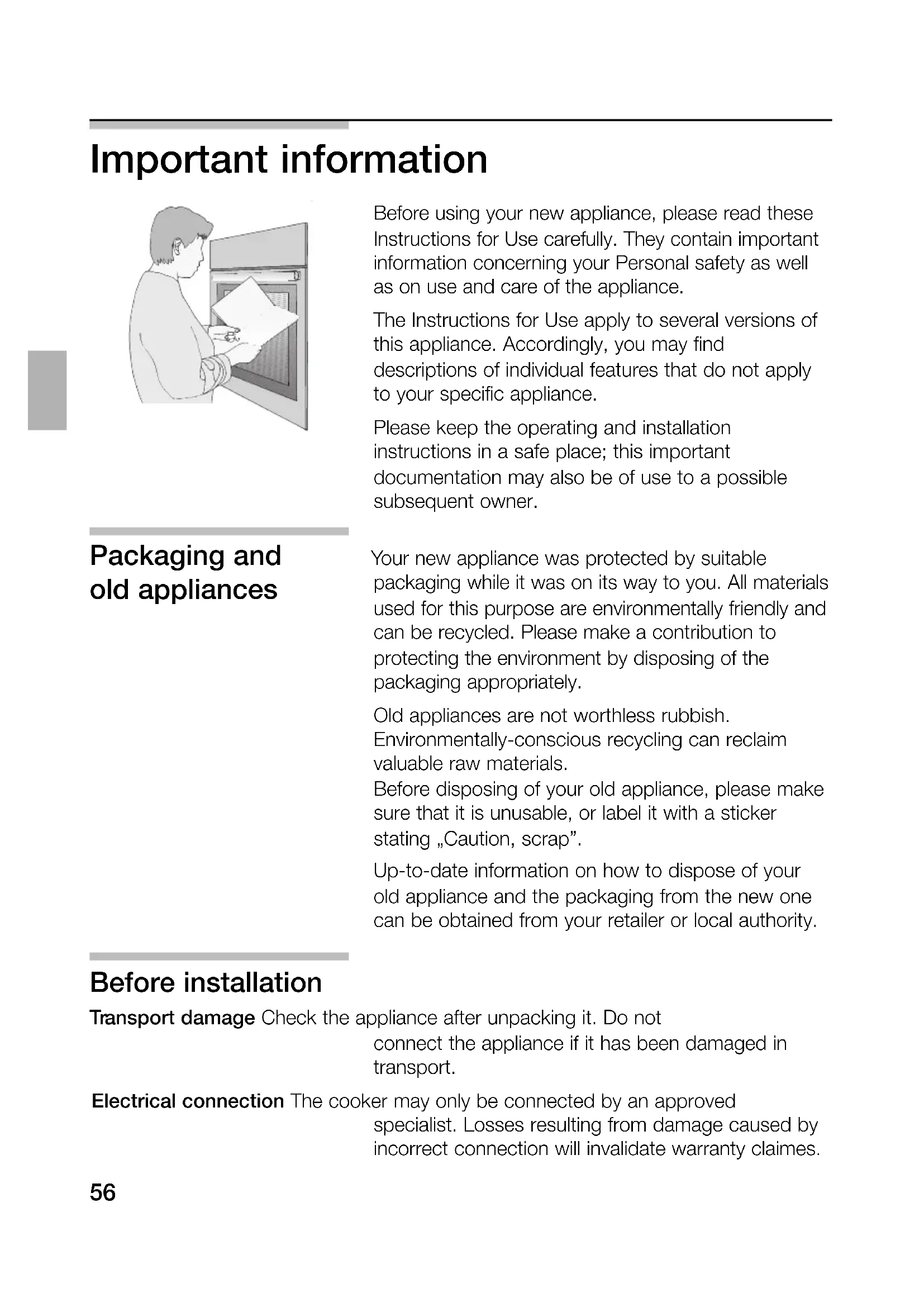 - Trouble-shooting Guide Important information Before using your new appliance, please read these Instructions for Use carefully. They contain important information concerning your Personal safety as well as on use and care of the appliance. The Instructions for Use apply to several versions of this appliance. Accordingly, you may find descriptions of individual features that do not apply to your specific appliance. Please keep the operating and installation instructions in a safe place; this important documentation may also be of use to a possible subsequent owner. Packaging and Your new appliance was protected by suitable old appliances packaging while it was on its way to you. All materials used for this purpose are environmentally friendly and can be recycled. Please make a contribution to protecting the environment by disposing of the packaging appropriately. Old appliances are not worthless rubbish. Environmentally-conscious recycling can reclaim valuable raw materials. Before disposing of your old appliance, please make sure that it is unusable, or label it with a sticker stating „Caution, scrap”. Up-to-date information on how to dispose of your old appliance and the packaging from the new one can be obtained from your retailer or local authority. Before installation Transport damage Check the appliance after unpacking it. Do not connect the appliance if it has been damaged in transport. Electrical connection The cooker may only be connected by an approved specialist. Losses resulting from damage caused by incorrect connection will invalidate warranty claimes.57 Safety information This appliance is intended for domestic use only. Only use the cooker for food preparation. Hot oven Open the oven door carefully. Hot steam may escape. Never touch the internal surfaces of the oven or the heating elements. There is a risk of burning. Children must be kept at a safe distance from the appliance. Never store combustible items in the oven. Risk of fire. Never place flammable objects onto the hot plates. Fire hazard! Never place cables of electronic devices onto the hot plates. Never clamp leads of electrical appliances in the hot oven door. The insulation on the leads could melt. There is a risk of short-circuiting. Caution: The extension rails heat up during oven operation. Use special care to avoid burns when extending the rails. Remove all packaging remnants, e.g. polystyrene parts, from the oven. Repairs Incorrectly done repairs are dangerous. There is a risk of electrocution. Repairs may only be carried out by after-sales service technicians who have been fully trained by BSH. If there is a fault, switch off the oven fuse at the fuse box. Call the after-sales service.58 Reasons for damage Baking sheet or aluminium Do not place baking sheets on the oven floor. Do not foil on the oven floor line the oven floor with aluminium foil. This causes heat to accumulate. Baking and roasting times will no longer be correct and the enamel will be damaged. Baking paper If using hot air *, do not place greaseproof paper loosely in the oven (e.g. when heating the oven). The hot-air fan could draw in the paper which may damage the heater and fan. Water in the oven Never pour water directly into a hot oven. This could damage the enamel. Fruit juice When baking very moist fruit cakes, do not put too much on the baking sheet. Fruit juice dripping from the baking sheet leaves stains that cannot be removed. It is recommended that you use the deeper universal pan. Cooling with the oven door Only leave the oven to cool with the door closed. Do not allow anything to become trapped in the oven door. Even if you only leave the oven door open slightly, the fronts of adjacent units may become damaged over time. Very dirty oven seal If the oven seal is very dirty, the oven door will no longer close properly when the oven is in use. The fronts of adjacent units could be damaged. Keep the oven seal clean. Using the oven door as a Do not stand or sit on the oven door. seat Care and cleaning Do not use high-pressure cleaners or steam jets. Hotplates Keep an eye on pressure cookers during the heat-up phase. As soon as the proper cooking pressure is reached, reduce the heat setting. Please observe the separate operating instructions that came with your hob.59 Your new cooker Here you will learn more about your new oven. The control panel and its switches and indicators are explained here. The heating modes and the accessories included with your oven will be explained here. The control panel Rapid heating for hot air mode andbread-baking setting Oven functions p. 9656