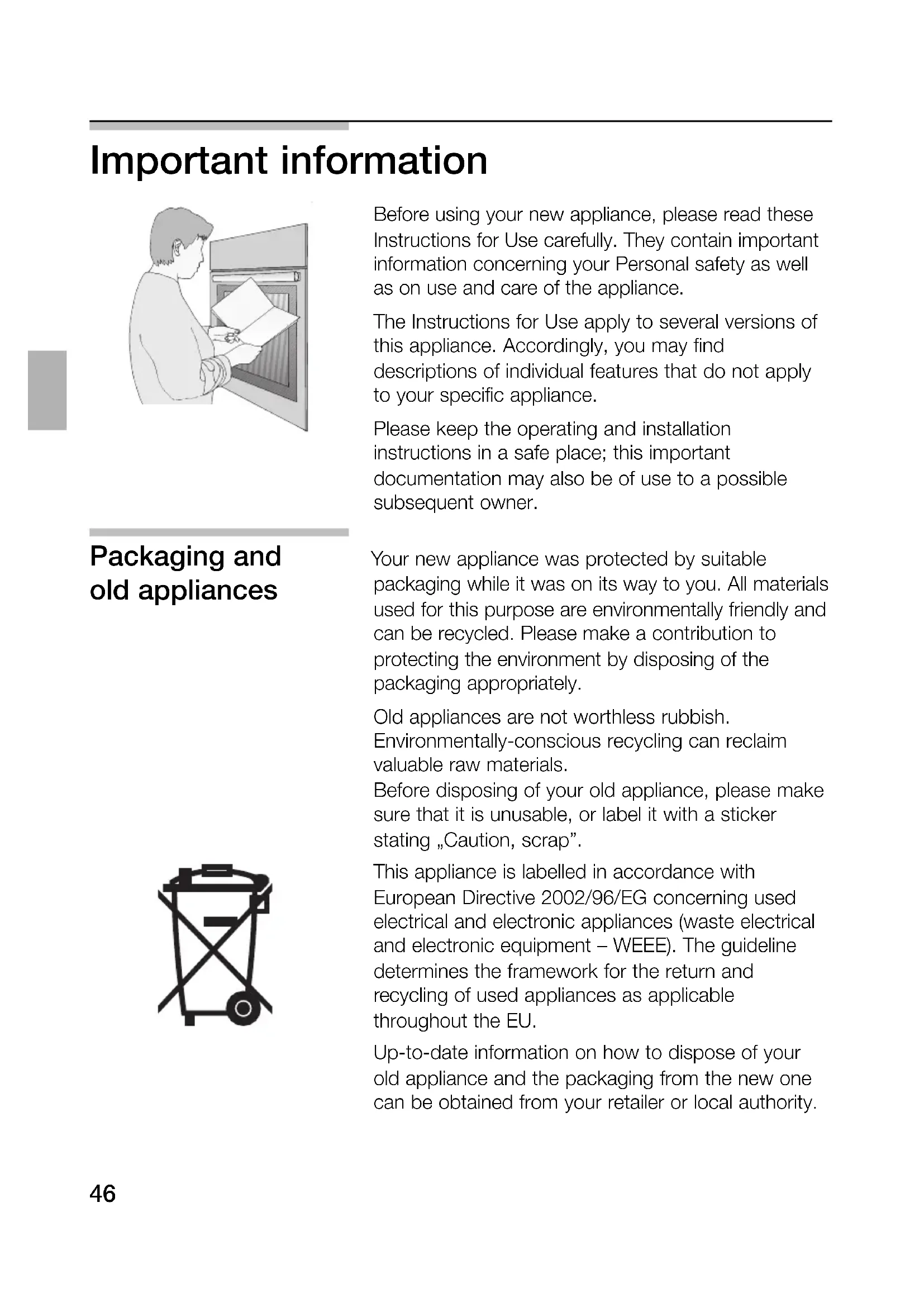 Always use the wire shelf and universal pan together. Turn the food after approx. two-thirds of the grilling time has elapsed. At your discretion, lightly baste the wire shelf and the food with oil. )66 Defrosting and cooking Defrosting with circotherm * Important heating system For defrosting and cooking of frozen or deep- information frozen foods, use only the circotherm heating system. With all deep-frozen foods, follow the food processing company‘s instructions on the package. As a rule, defrosted frozen or deep-frozen foods (especially meats) require less cooking time than fresh products, since freezing has a pre-cooking effect. If frozen meat is placed in the oven, the defrosting time must be added to the required cooking time. Always defrost deep-frozen poultry before cooking because the giblets must be removed. For cooking deep-frozen fish, use the same temperatures as for fresh fish. Deep-frozen ready-to-eat meals in aluminium dishes may be placed into the oven several at a time. Shelf positions With 1 bakings sheet: Shelf position 1 With 2 baking sheets: Shelf positions 1 + 3. All stated times are approximate guidelines that vary with the shape and volume of deep-frozen products.67 Defrosting and cooking Raw deep-frozen products or foods from a freezer always defrost at 50° C. Higher defrosting temperatures may cause the food to dry out. Defrost deep-frozen meals packed in aluminium foil or closed aluminium containers at a setting of 130 – 140° C. Defrost and warm up deep-frozen baked goods at 100 – 140° C. Brush bread, rolls or yeast pastry lightly with water to make the crust more appealing. Defrost dry deep-frozen yeast cakes at 160 – 170° C for 20 – 30 minutes. Defrost moist deep-frozen yeast cakes (with fruit topping) at 160 – 170° C for 30 – 50 minutes after wrapping in aluminium foil to prevent cake from drying out. Defrost and toast deep-frozen toast (with topping) at 160 – 170° C for about 20 minutes. Frozen pizza: Please follow the manufacturers’ instructions. Defrosting position e Recommended for delicate pastries only (i.e., whipped-cream gateaus). Turn the function selector switch to the e position. Dependent on size and type of the baked goods, defrost 25 – 45 minutes, take out of the oven and allow to stand 30 – 45 minutes. With smaller amounts (pastries), the defrosting time is reduced to 15 – 20 minutes and the subsequent standing time to 10 – 15 minutes.68 Cleaning and Care Important cleaning For cleaning, do not use abrasives, no corrosive basics cleaners, and no sharp objects. Do not scratch off burnt-in food residues, but soak them off with a moist cloth and dishwashing detergent. Cleaning products we particularly recommend can be purchased from our customer service. Appliance exterior Stainless steel/ Use commercially available detergents applied to a aluminium front soft, moistened cloth or a chamois. Do not use aggressive cleaning agents, abrasive sponges, or coarse cleaning cloths. On heavy soiling use commercial cleaning agents on matted stainless steel/aluminium surfaces. Please observe the manufacturer’s instructions. Enamel and glass Use commercially available detergents applied to a soft, moistened cloth or a chamois. Oven door pane The temperature of the pane inside the oven door is reduced by a heat-reflecting coating. The reduced temperature ensures that visibility through the oven door window is not impaired. When the oven door is open, this coating may have a bright appearance. This is quite normal and does not indicate a quality defect. Oven interior Clean the oven after each use, especially after roasting or grilling. Food remnants burn in when the oven is reheated. The baked in remnants are very difficult to remove once burnt in.69 Note: To prevent soiling use: