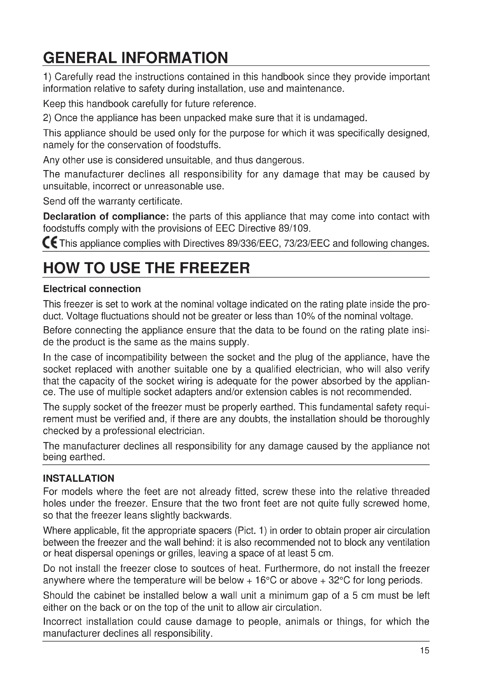This appliance should be used only for the purpose for which it was specifically designed, namely for the conservation of foodstuffs. Any other use is considered unsuitable, and thus dangerous. The manufacturer declines all responsibility for any damage that may be caused by unsuitable, incorrect or unreasonable use. Send off the warranty certificate. Declaration of compliance: the parts of this appliance that may come into contact with foodstuffs comply with the provisions of EEC Directive 89/109. This appliance complies with Directives 89/336/EEC, 73/23/EEC and following changes.