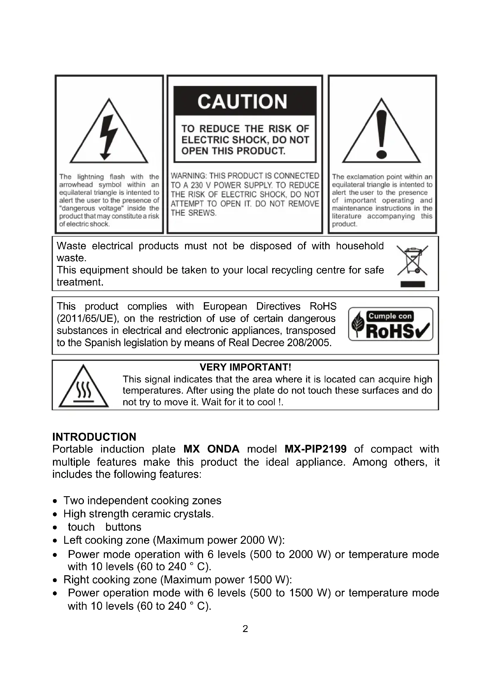 Download the instructions for your Cooker in PDF format for free! Find your manual MXPIP2199 - Mx Onda and take your electronic device back in hand. On this page are published all the documents necessary for the use of your device. MXPIP2199 by Mx Onda.