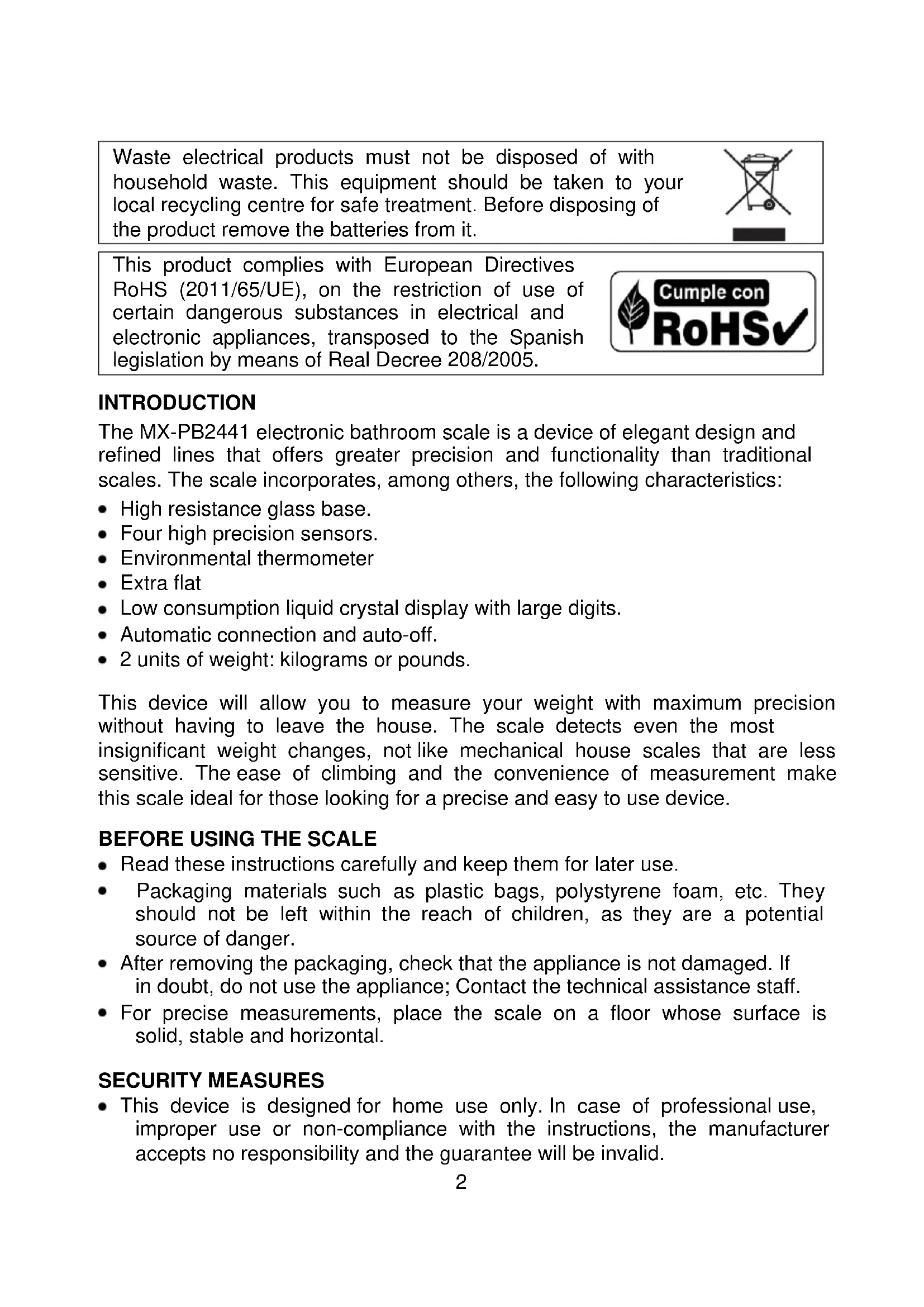 Waste electrical products must not be disposed of with household waste. This equipment should be taken to your local recycling centre for safe treatment. Before disposing of the product remove the batteries from it. This product complies with European Directives RoHS (2011/65/UE), on the restriction of use of certain dangerous substances in electrical and electronic appliances, transposed to the Spanish legislation by means of Real Decree 208/2005. INTRODUCTION The MX-PB2441 electronic bathroom scale is a device of elegant design and refined lines that offers greater precision and functionality than traditional scales. The scale incorporates, among others, the following characteristics: High resistance glass base. Four high precision sensors. Environmental thermometer Extra flat Low consumption liquid crystal display with large digits. Automatic connection and auto-off. 2 units of weight: kilograms or pounds. This device will allow you to measure your weight with maximum precision without having to leave the house. The scale detects even the most insignificant weight changes, not like mechanical house scales that are less sensitive. The ease of climbing and the convenience of measurement make this scale ideal for those looking for a precise and easy to use device.