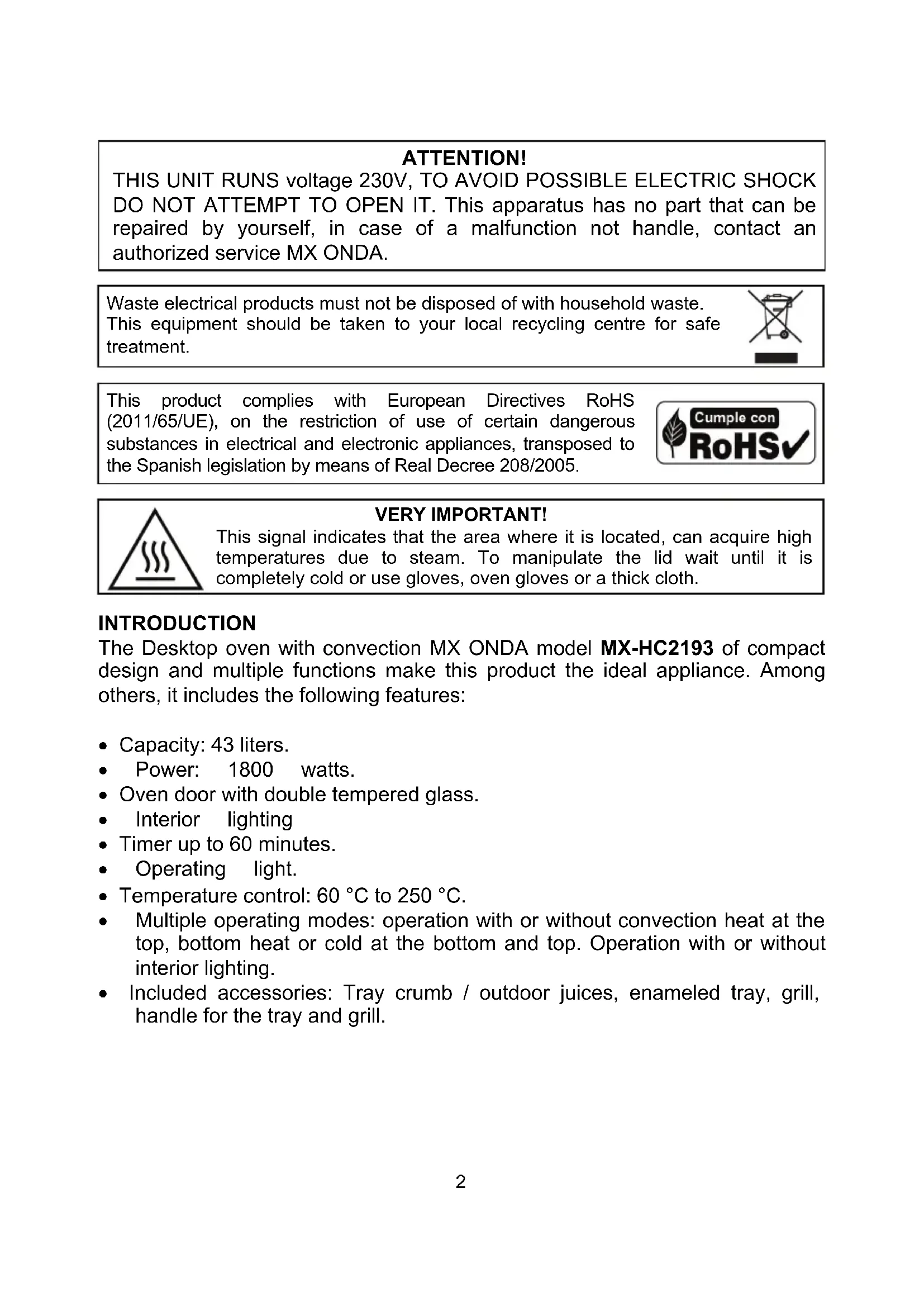 VERY IMPORTANT! This signal indicates that the area where it is located, can acquire high temperatures due to steam. To manipulate the lid wait until it is completely cold or use gloves, oven gloves or a thick cloth. INTRODUCTION The Desktop oven with convection MX ONDA model MX-HC2193 of compact design and multiple functions make this product the ideal appliance. Among others, it includes the following features: