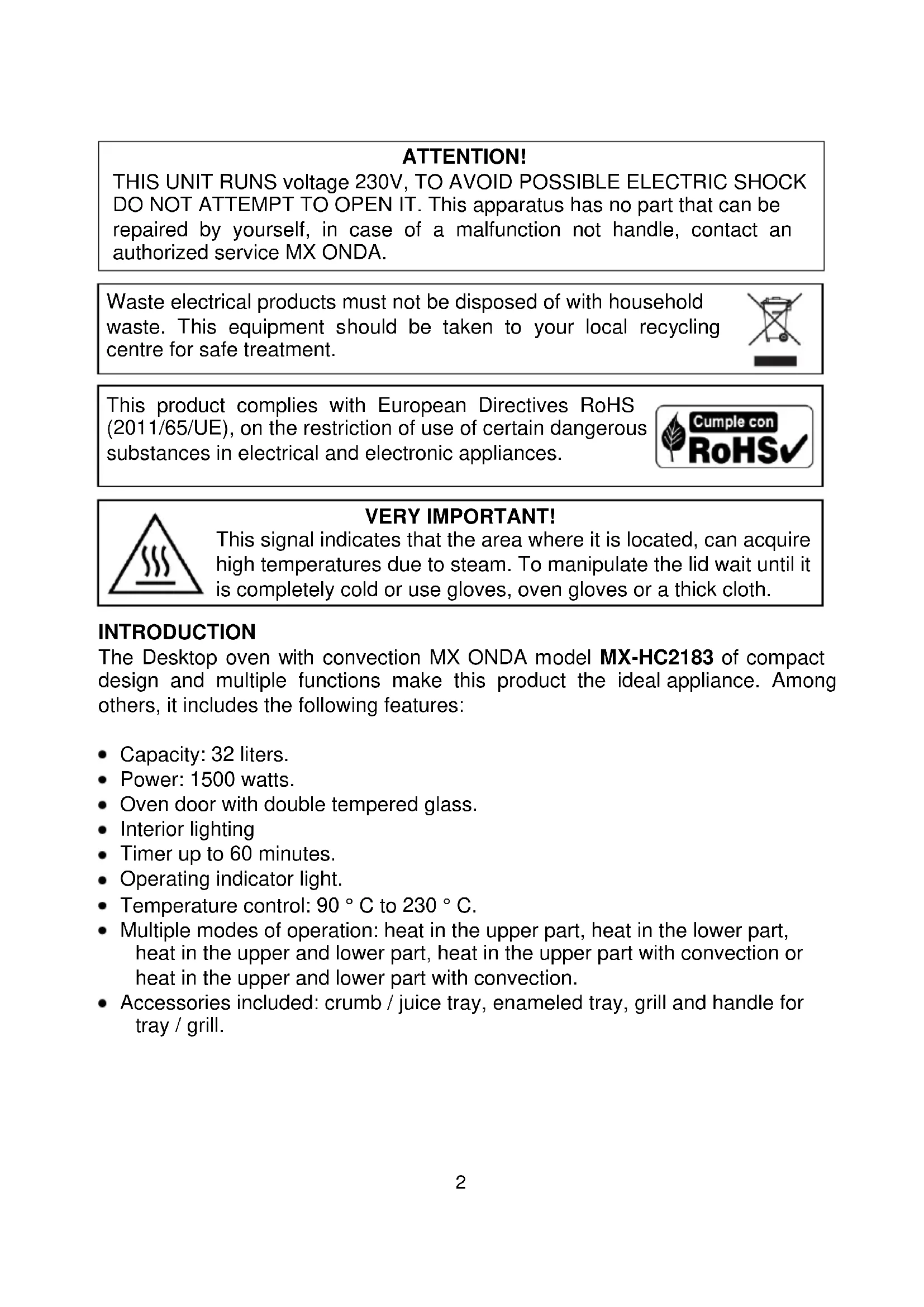 Download the instructions for your Oven in PDF format for free! Find your manual MXHC2183 - Mx Onda and take your electronic device back in hand. On this page are published all the documents necessary for the use of your device. MXHC2183 by Mx Onda.