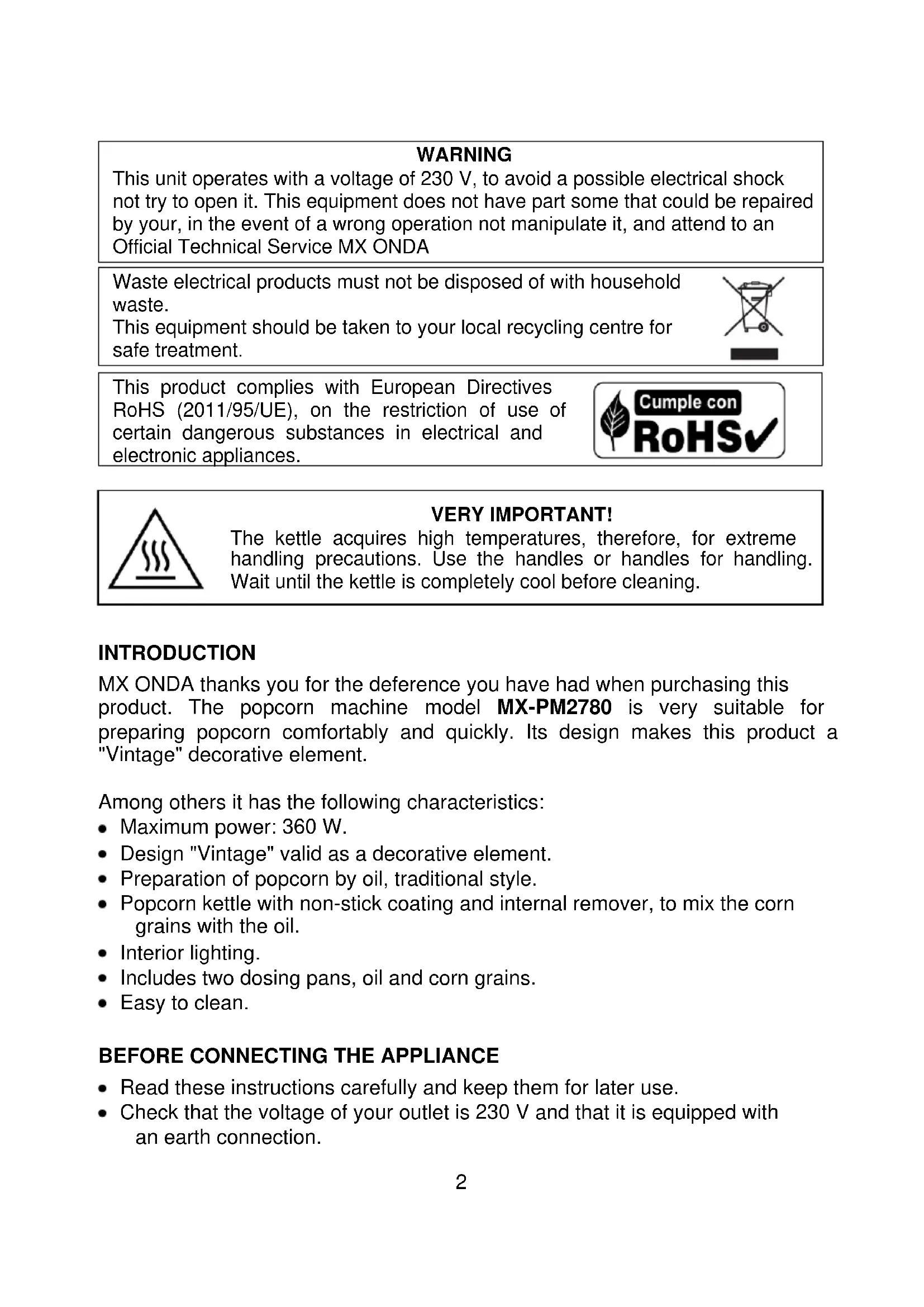 MX ONDA thanks you for the deference you have had when purchasing this product. The popcorn machine model MX-PM2780 is very suitable for preparing popcorn comfortably and quickly. Its design makes this product a "Vintage" decorative element.
