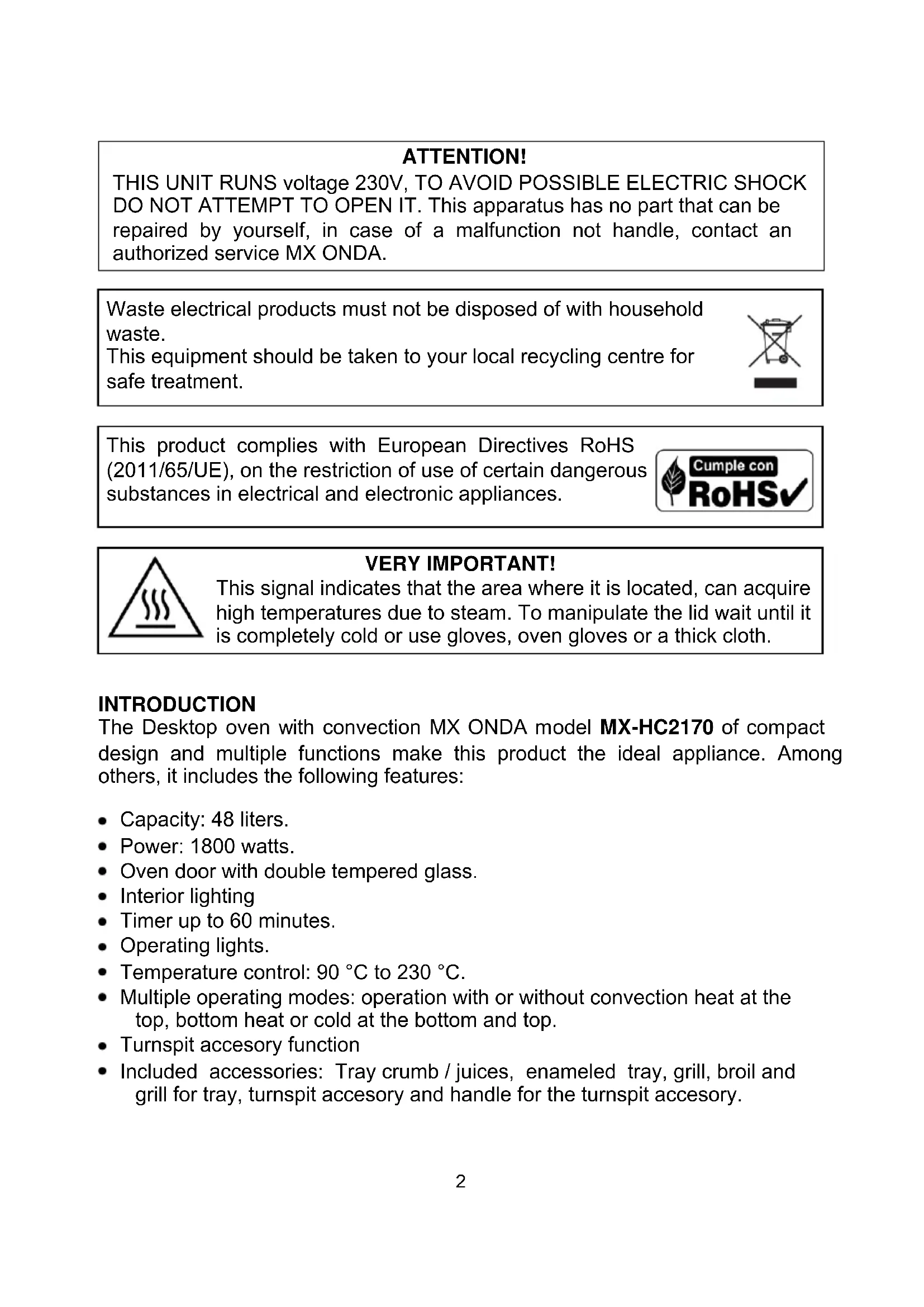 INTRODUCTION The Desktop oven with convection MX ONDA model MX-HC2170 of compact design and multiple functions make this product the ideal appliance. Among others, it includes the following features: Capacity: 48 liters. Power: 1800 watts. Oven door with double tempered glass. Interior lighting Timer up to 60 minutes. Operating lights. Temperature control: 90 °C to 230 °C. Multiple operating modes: operation with or without convection heat at the top, bottom heat or cold at the bottom and top. Turnspit accesory function Included accessories: Tray crumb / juices, enameled tray, grill, broil and grill for tray, turnspit accesory and handle for the turnspit accesory.