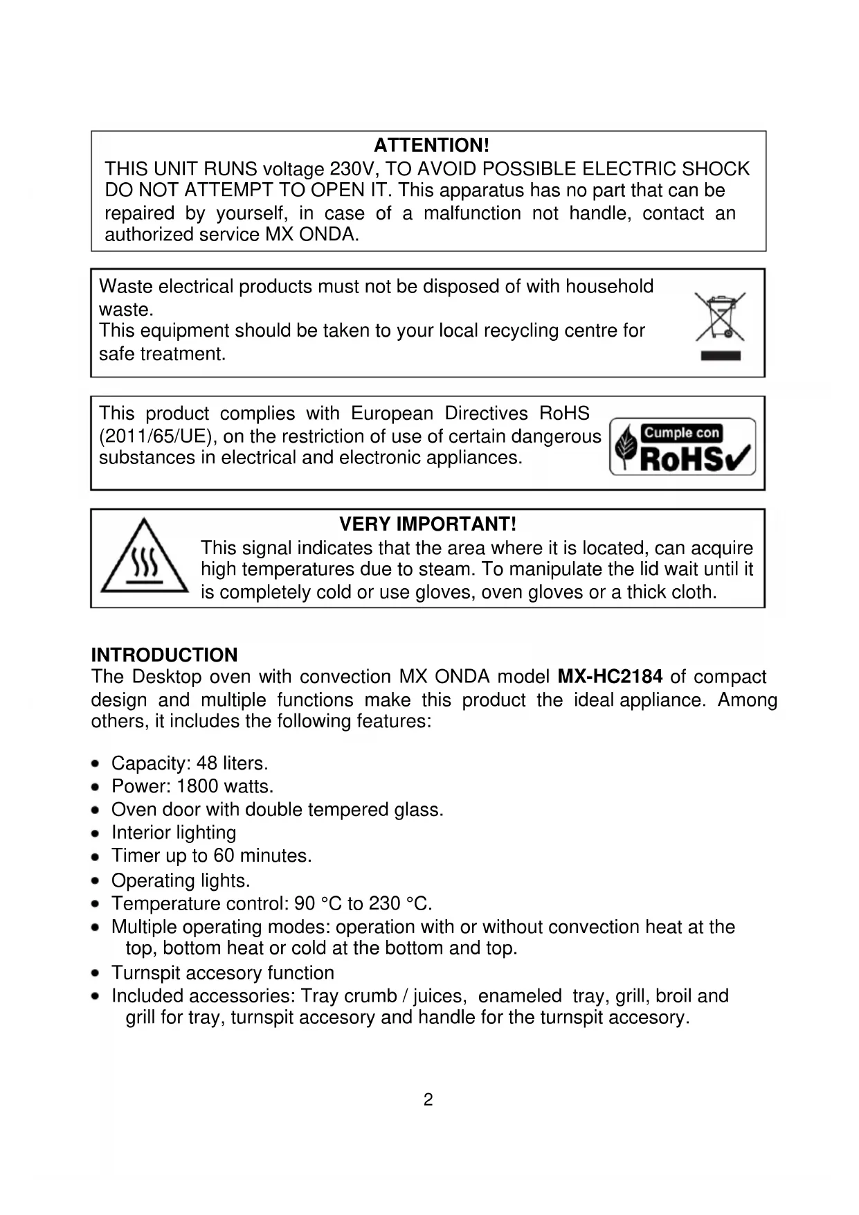 INTRODUCTION The Desktop oven with convection MX ONDA model MX-HC2184 of compact design and multiple functions make this product the ideal appliance. Among others, it includes the following features: Capacity: 48 liters. Power: 1800 watts. Oven door with double tempered glass. Interior lighting Timer up to 60 minutes. Operating lights. Temperature control: 90 °C to 230 °C. Multiple operating modes: operation with or without convection heat at the top, bottom heat or cold at the bottom and top. Turnspit accesory function Included accessories: Tray crumb / juices, enameled tray, grill, broil and grill for tray, turnspit accesory and handle for the turnspit accesory.
