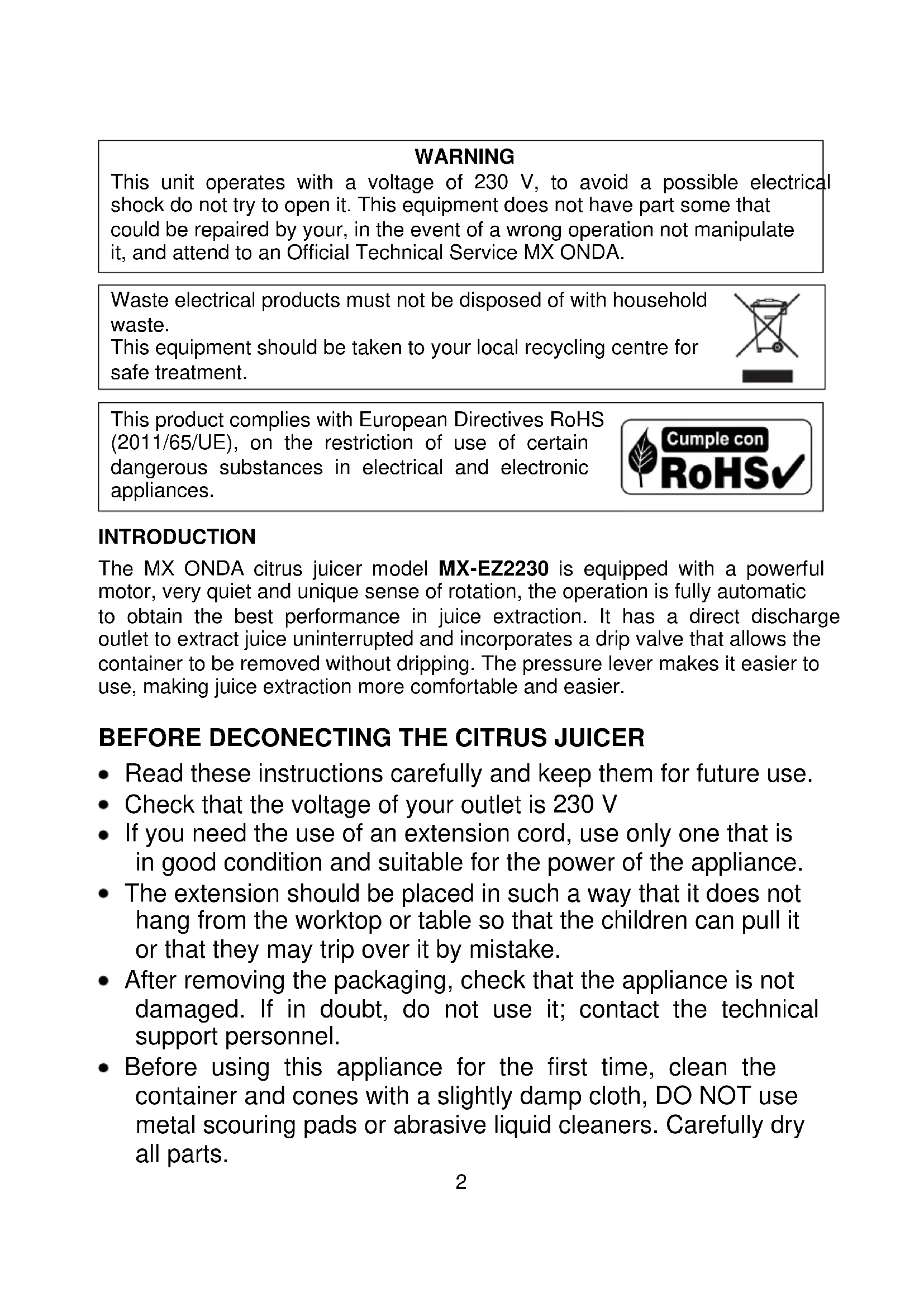 MXEZ2230 - Juicer Mx Onda - Free user manual and instructions