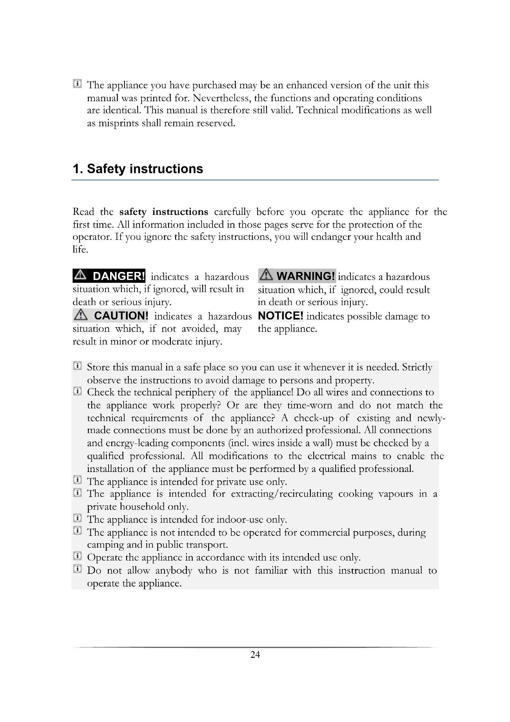 Read the safety instructions carefully before you operate the appliance for the first time. All information included in those pages serve for the protection of the operator. If you ignore the safety instructions, you will endanger your health and life. DANGER! indicates a hazardous situation which, if ignored, will result in death or serious injury. WARNING! indicates a hazardous situation which, if ignored, could result in death or serious injury. CAUTION! indicates a hazardous situation which, if not avoided, may result in minor or moderate injury. NOTICE! indicates possible damage to the appliance. Store this manual in a safe place so you can use it whenever it is needed. Strictly observe the instructions to avoid damage to persons and property. Check the technical periphery of the appliance! Do all wires and connections to the appliance work properly? Or are they time-worn and do not match the technical requirements of the appliance? A check-up of existing and newly- made connections must be done by an authorized professional. All connections and energy-leading components (incl. wires inside a wall) must be checked by a qualified professional. All modifications to the electrical mains to enable the installation of the appliance must be performed by a qualified professional. The appliance is intended for private use only. The appliance is intended for extracting/recirculating cooking vapours in a private household only. The appliance is intended for indoor-use only. The appliance is not intended to be operated for commercial purposes, during camping and in public transport. Operate the appliance in accordance with its intended use only. Do not allow anybody who is not familiar with this instruction manual to operate the appliance.25 DANGER