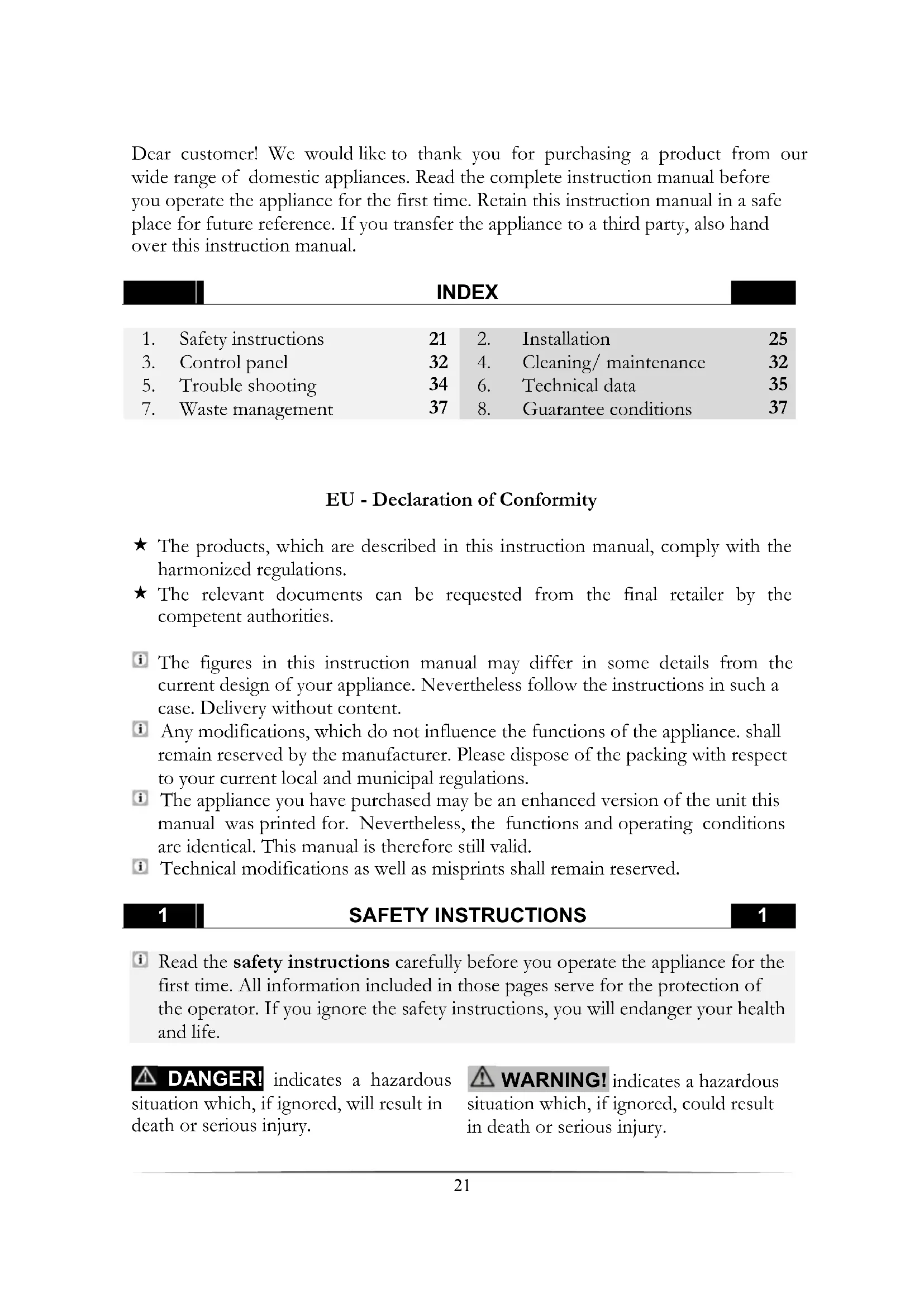 EU - Declaration of Conformity The products, which are described in this instruction manual, comply with the harmonized regulations. The relevant documents can be requested from the final retailer by the competent authorities. The figures in this instruction manual may differ in some details from the current design of your appliance. Nevertheless follow the instructions in such a case. Delivery without content. Any modifications, which do not influence the functions of the appliance. shall remain reserved by the manufacturer. Please dispose of the packing with respect to your current local and municipal regulations. The appliance you have purchased may be an enhanced version of the unit this manual was printed for. Nevertheless, the functions and operating conditions are identical. This manual is therefore still valid. Technical modifications as well as misprints shall remain reserved.