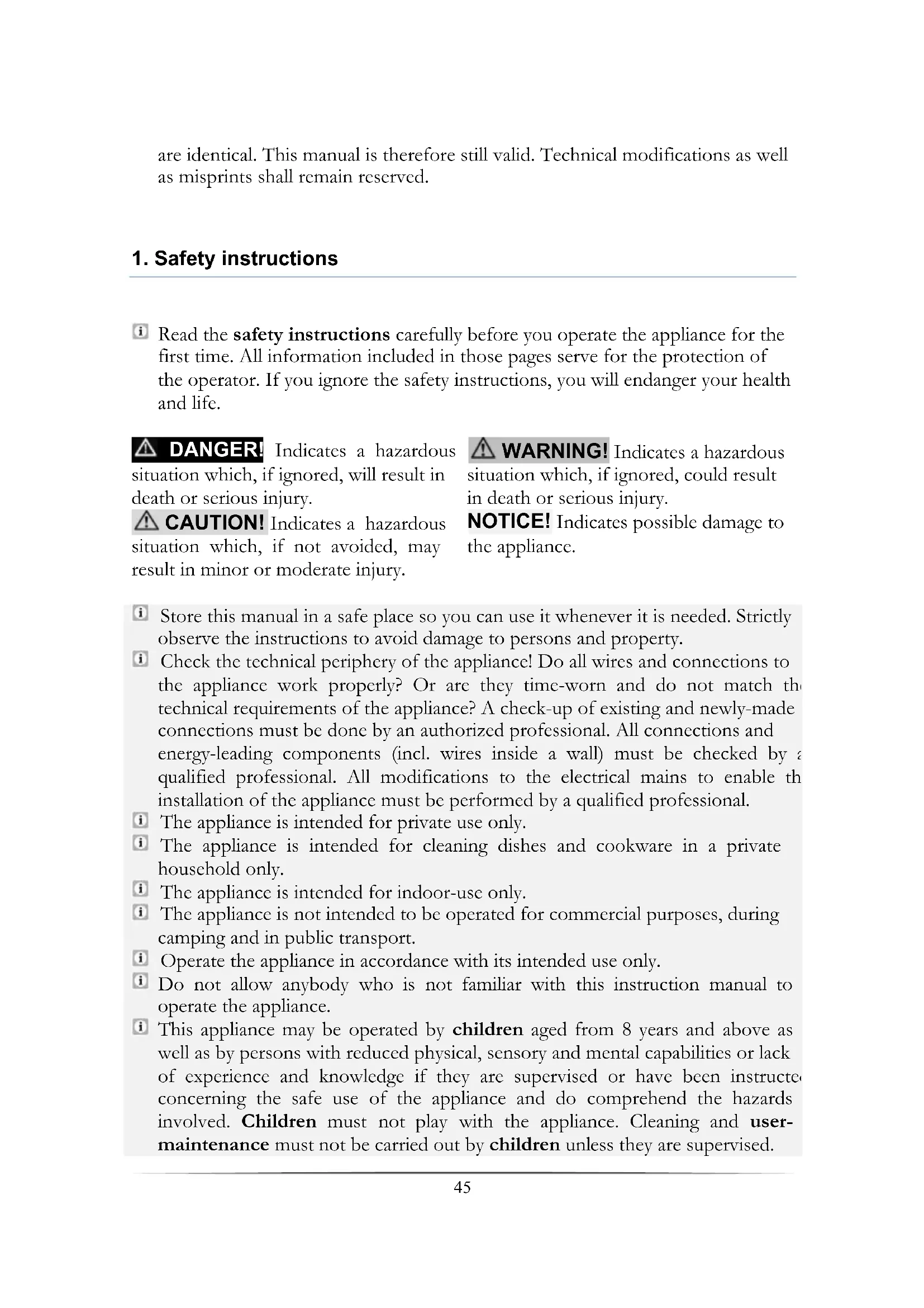 Read the safety instructions carefully before you operate the appliance for the first time. All information included in those pages serve for the protection of the operator. If you ignore the safety instructions, you will endanger your health and life. DANGER! Indicates a hazardous situation which, if ignored, will result in death or serious injury. WARNING! Indicates a hazardous situation which, if ignored, could result in death or serious injury. CAUTION! Indicates a hazardous situation which, if not avoided, may result in minor or moderate injury. NOTICE! Indicates possible damage to the appliance.