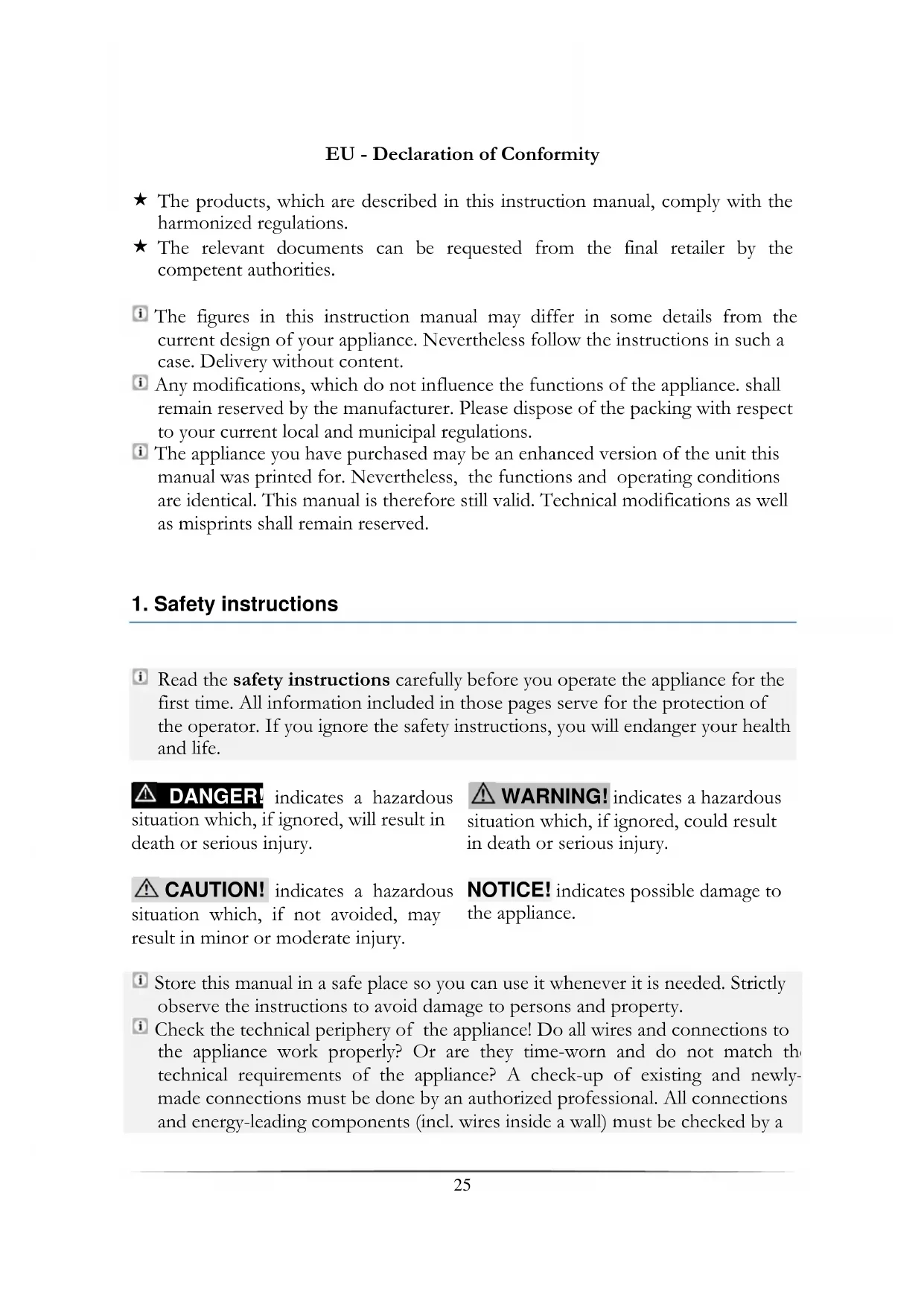 Read the safety instructions carefully before you operate the appliance for the first time. All information included in those pages serve for the protection of the operator. If you ignore the safety instructions, you will endanger your health and life. DANGER! indicates a hazardous situation which, if ignored, will result in death or serious injury. WARNING! indicates a hazardous situation which, if ignored, could result in death or serious injury. CAUTION! indicates a hazardous situation which, if not avoided, may result in minor or moderate injury. NOTICE! indicates possible damage to the appliance.