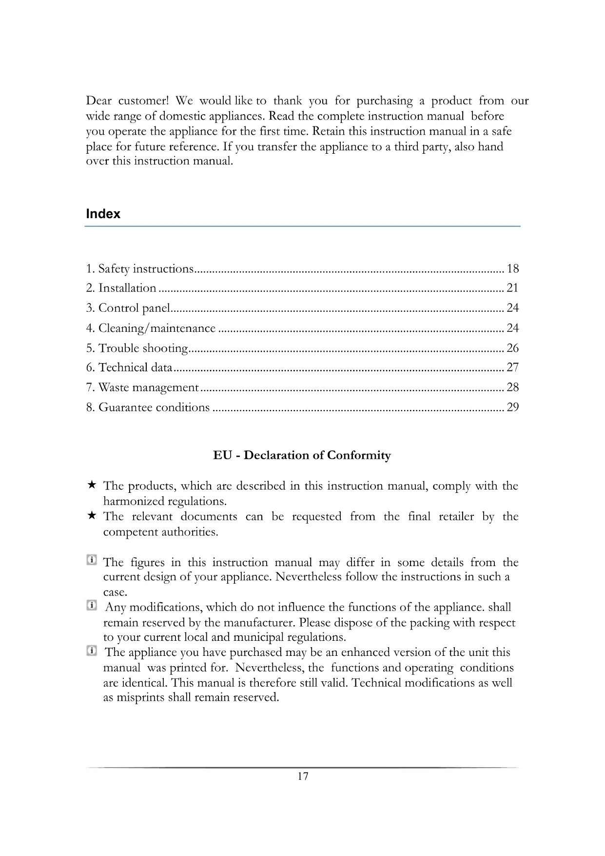 EU - Declaration of Conformity The products, which are described in this instruction manual, comply with the harmonized regulations. The relevant documents can be requested from the final retailer by the competent authorities. The figures in this instruction manual may differ in some details from the current design of your appliance. Nevertheless follow the instructions in such a case. Any modifications, which do not influence the functions of the appliance. shall remain reserved by the manufacturer. Please dispose of the packing with respect to your current local and municipal regulations. The appliance you have purchased may be an enhanced version of the unit this manual was printed for. Nevertheless, the functions and operating conditions are identical. This manual is therefore still valid. Technical modifications as well as misprints shall remain reserved.18