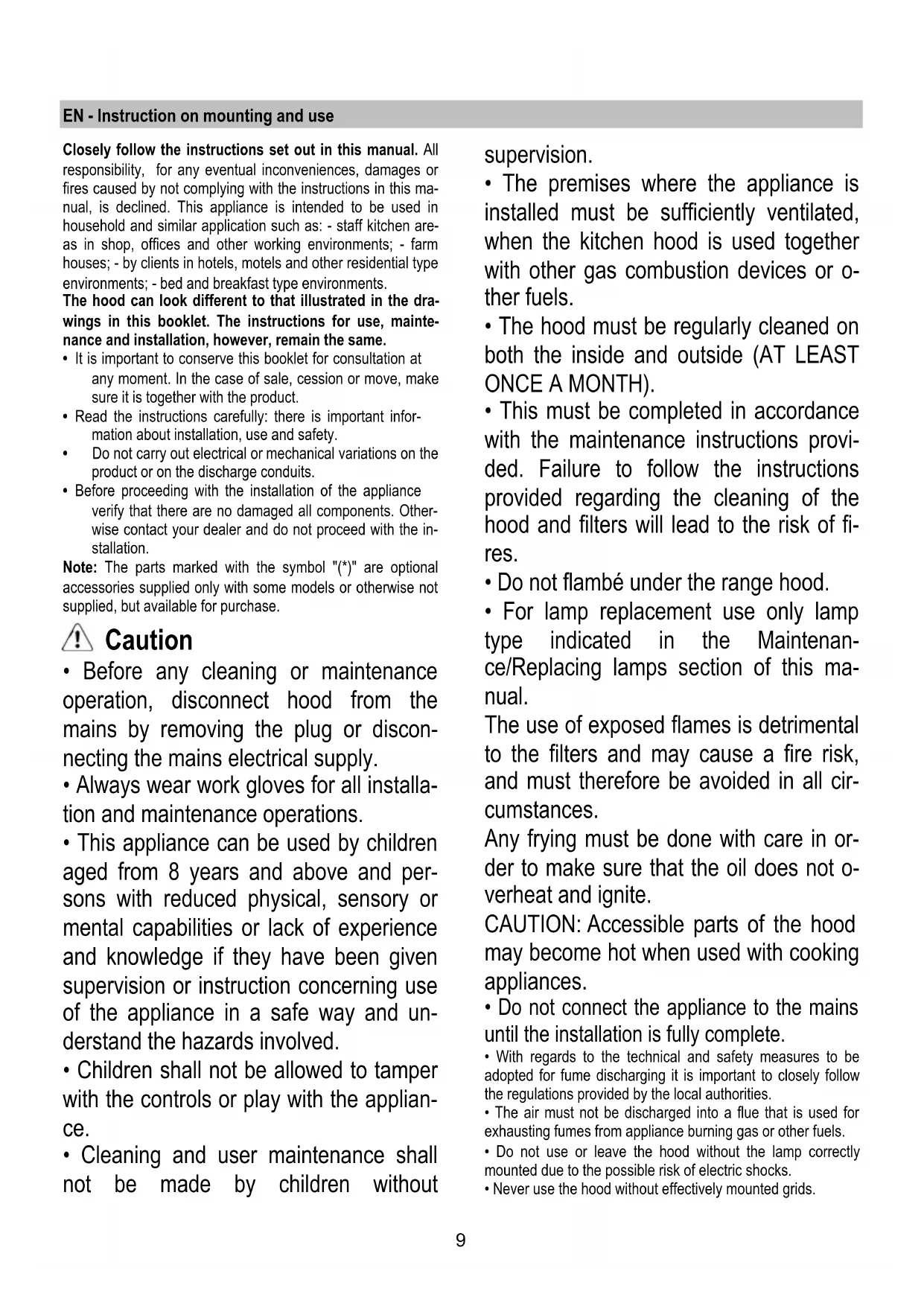 - For lamp replacement use only lamp type indicated in the Maintenan- ce/Replacing lamps section of this ma- nual. The use of exposed flames is detrimental to the filters and may cause a fire risk, and must therefore be avoided in all cir- cumstances. Any frying must be done with care in or- der to make sure that the oil does not o- verheat and ignite. CAUTION: Accessible parts of the hood may become hot when used with cooking appliances.