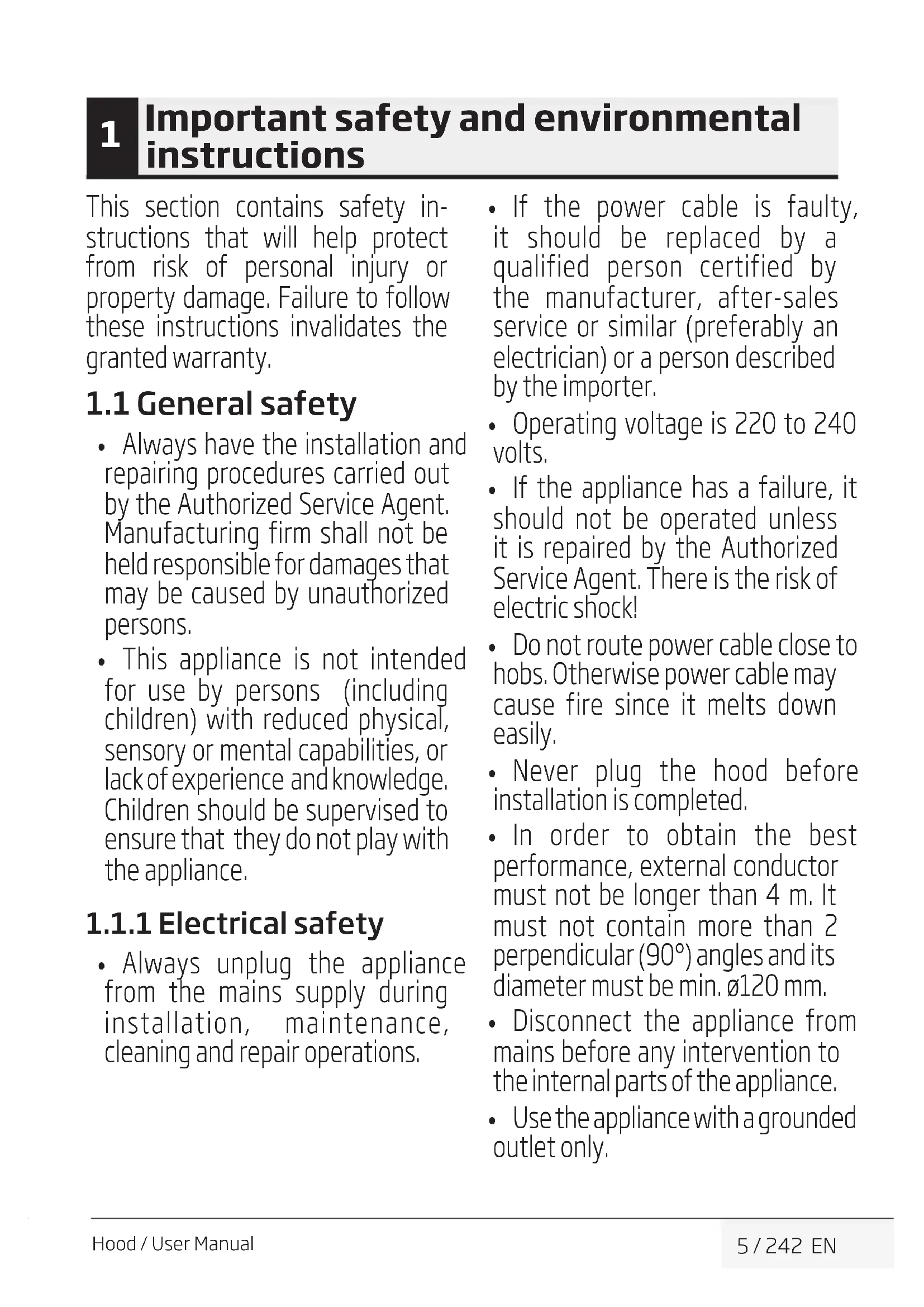- When the hood is in use, especially together with gas cookers, make sure that environment is ventilated with clean air.7 / 242 EN Hood / User Manual
