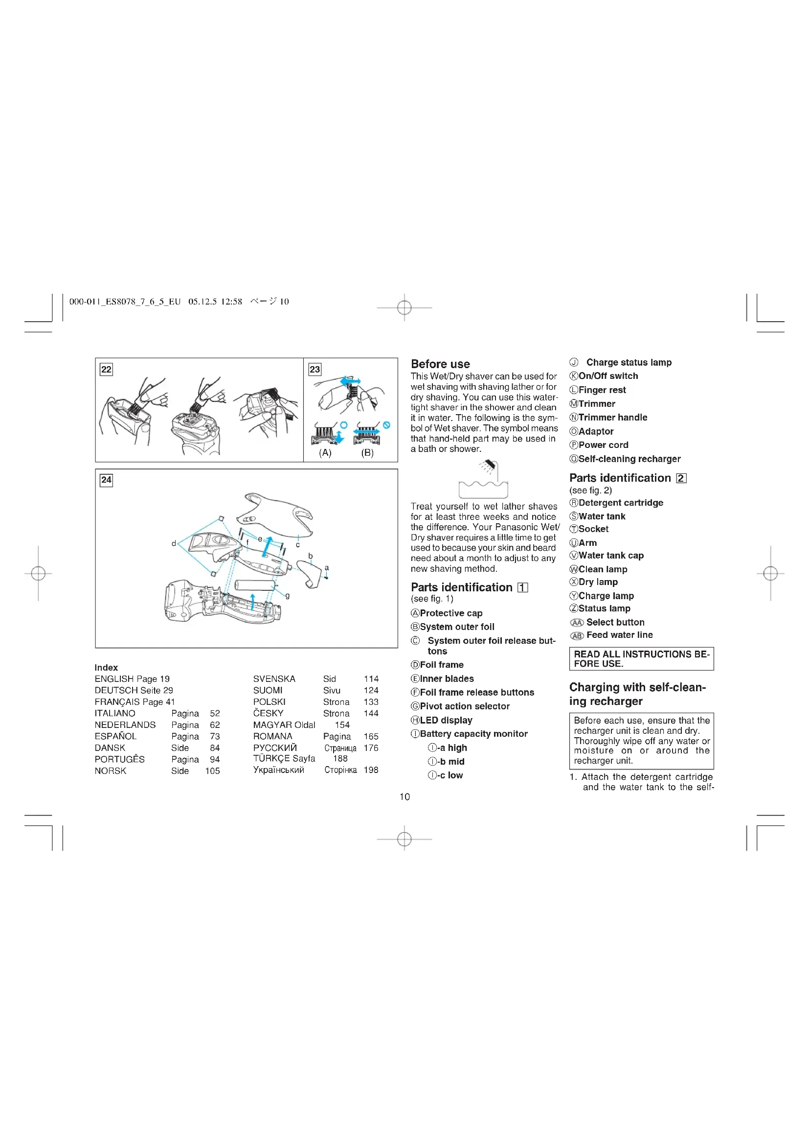 000-011ES8078765EU 05.12.5 12:58 ページ9Before use This Wet/Dry shaver can be used for wet shaving with shaving lather or for dry shaving. You can use this water- tight shaver in the shower and clean it in water. The following is the sym- bol of Wet shaver. The symbol means that hand-held part may be used in a bath or shower. Treat yourself to wet lather shaves for at least three weeks and notice the difference. Your Panasonic Wet/ Dry shaver requires a little time to get used to because your skin and beard need about a month to adjust to any new shaving method. Parts identification 1 (see fig. 1) A Protective cap B System outer foil C System outer foil release but- tons D Foil frame E Inner blades F Foil frame release buttons G Pivot action selector H LED display I Battery capacity monitor I-a high I-b mid I-c low J Charge status lamp K On/Off switch L Finger rest M Trimmer N Trimmer handle O Adaptor P Power cord Q Self-cleaning recharger Parts identification 2 (see fig. 2) R Detergent cartridge S Water tank T Socket U Arm V Water tank cap W Clean lamp X Dry lamp Y Charge lamp Z Status lamp Select button Feed water line