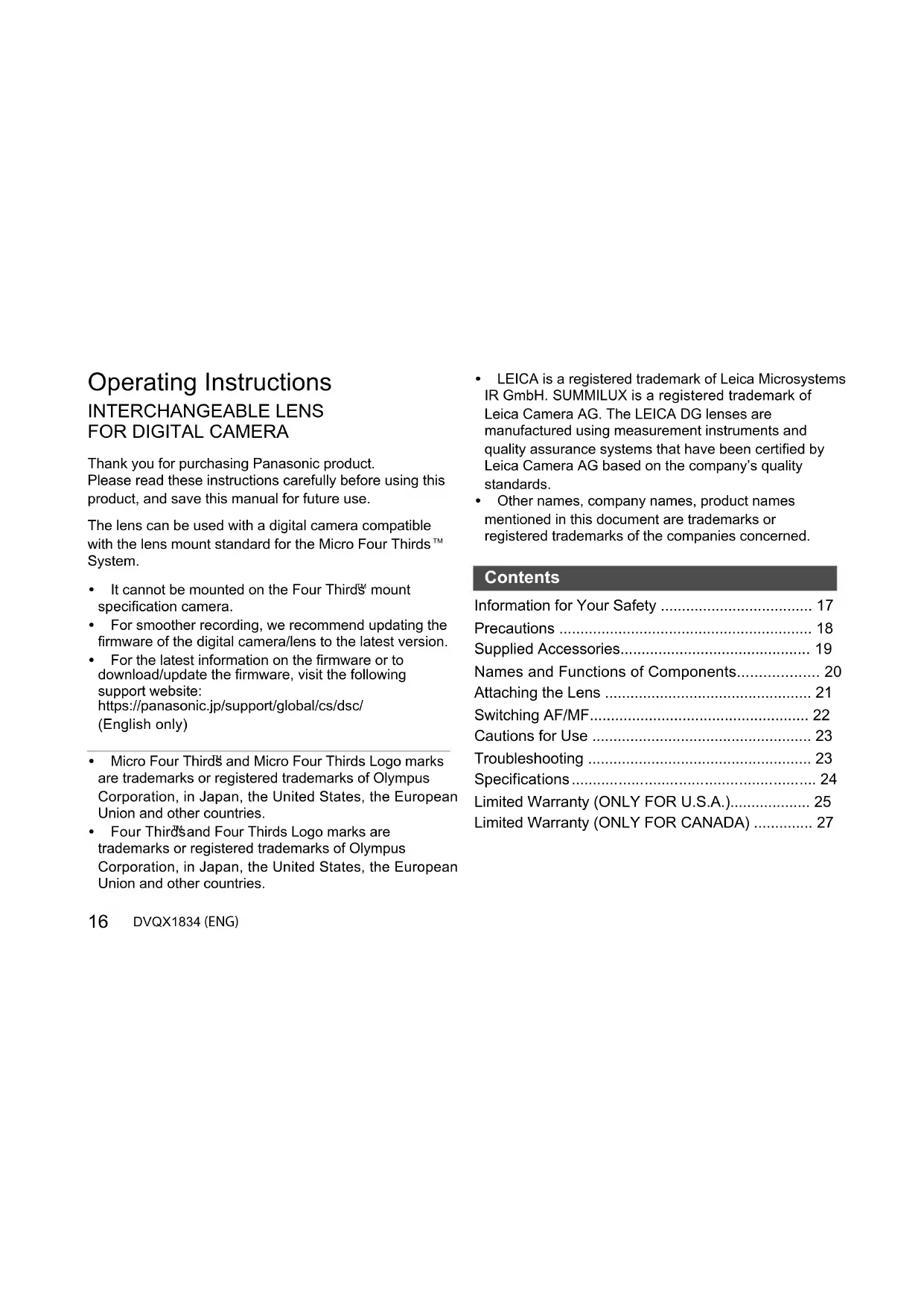 Thank you for purchasing Panasonic product.Please read these instructions carefully before using this product, and save this manual for future use.The lens can be used with a digital camera compatible with the lens mount standard for the Micro Four Thirds
