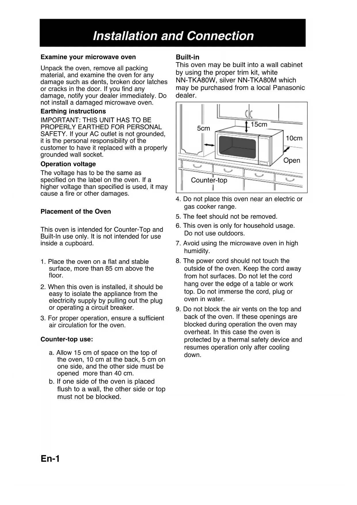 air circulation for the oven. Counter-top use: a. Allow 15 cm of space on the top of the oven, 10 cm at the back, 5 cm on one side, and the other side must be opened more than 40 cm. b. If one side of the oven is placed flush to a wall, the other side or top must not be blocked. Counter-top Installation and Connection Open 10cm 15cm 5cm Built-in This oven may be built into a wall cabinet by using the proper trim kit, white NN-TKA80W, silver NN-TKA80M which may be purchased from a local Panasonic dealer. En-1