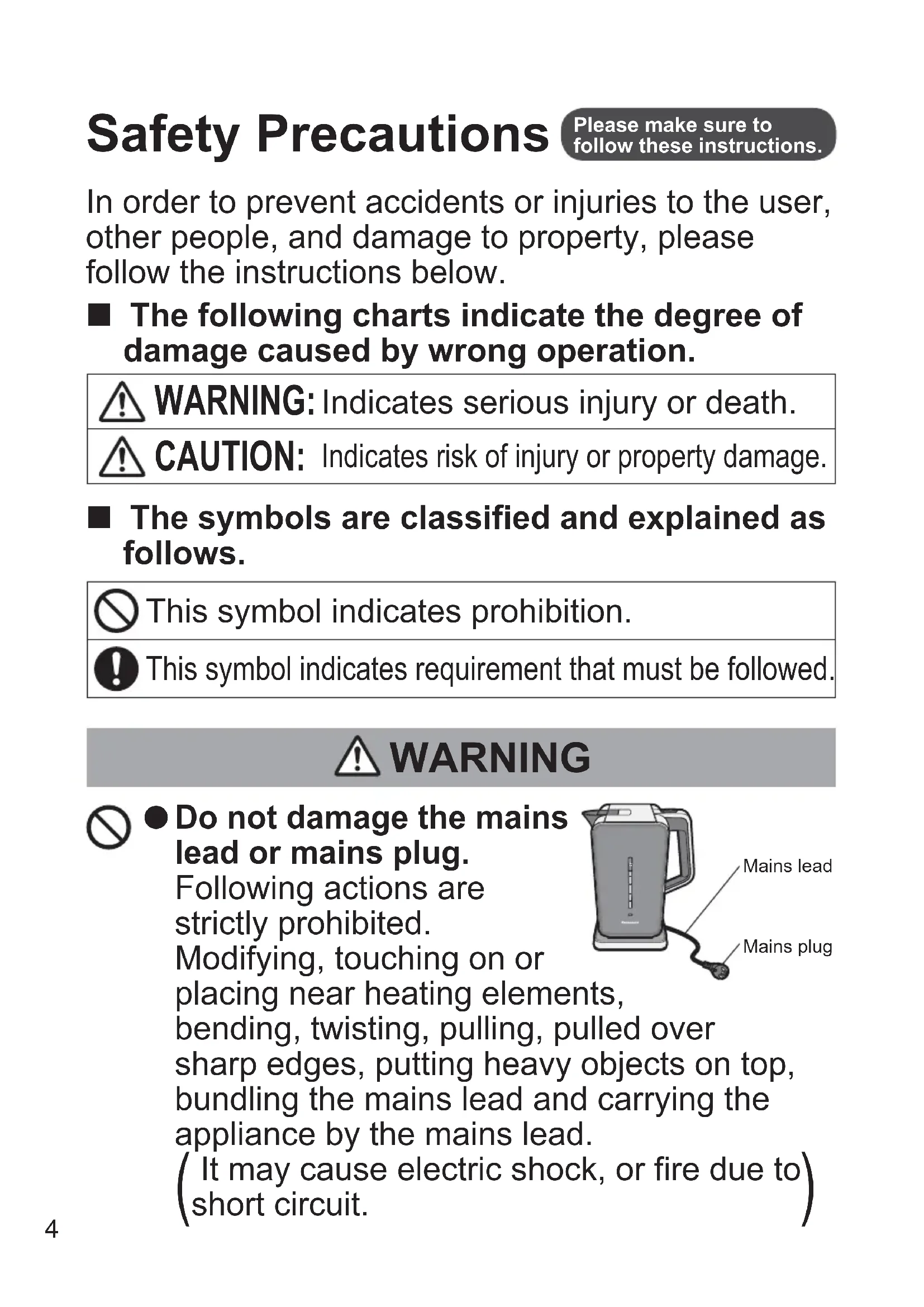 lead or mains plug. Following actions are strictly prohibited. Modifying, touching on or placing near heating elements, bending, twisting, pulling, pulled over sharp edges, putting heavy objects on top, bundling the mains lead and carrying the appliance by the mains lead.