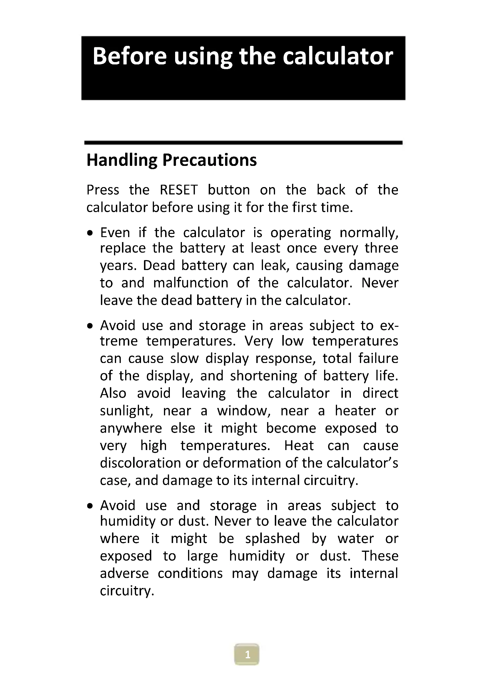 - Avoid use and storage in areas subject to humidity or dust. Never to leave the calculator where it might be splashed by water or exposed to large humidity or dust. These adverse conditions may damage its internal circuitry. Before using the calculator2