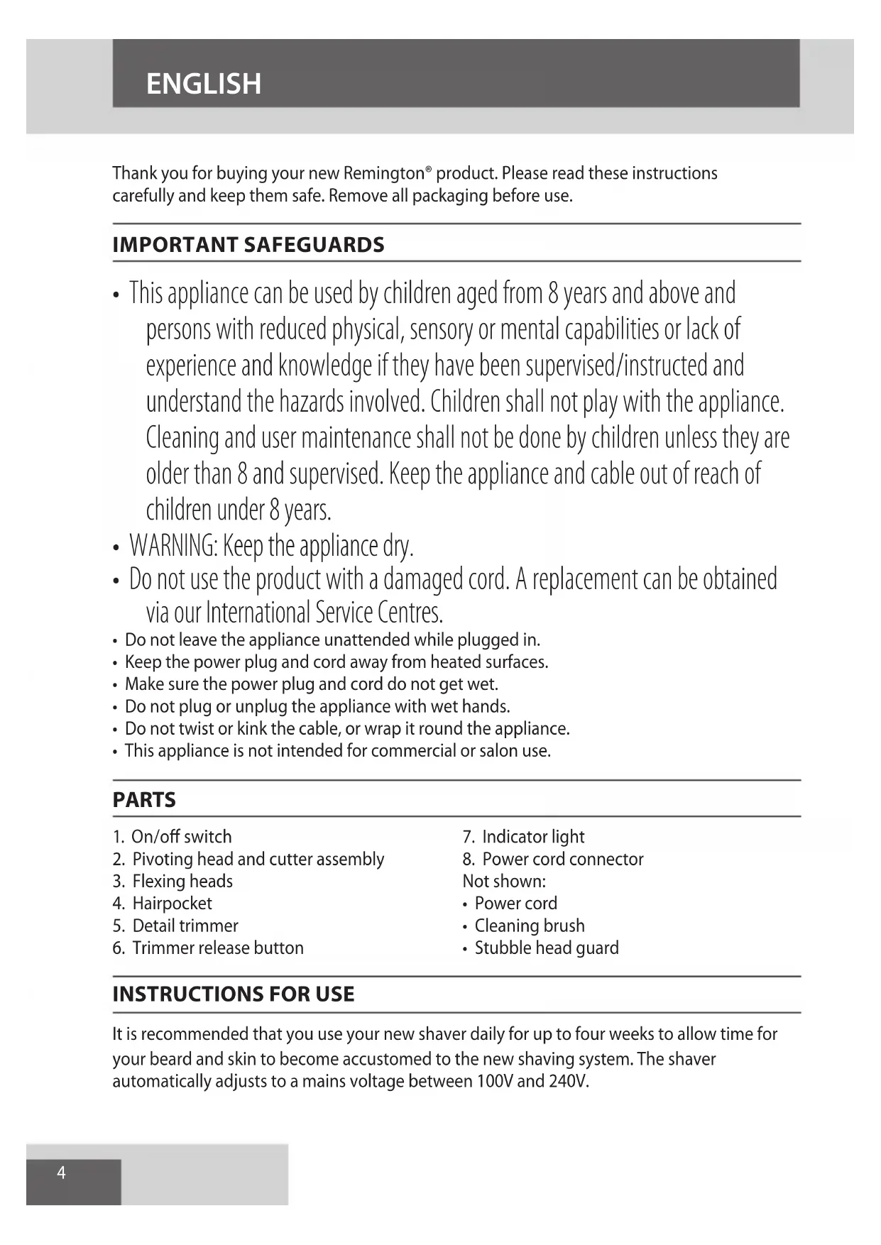 It is recommended that you use your new shaver daily for up to four weeks to allow time for your beard and skin to become accustomed to the new shaving system. The shaver automatically adjusts to a mains voltage between 100V and 240V. ENGLISH5 ENGLISH