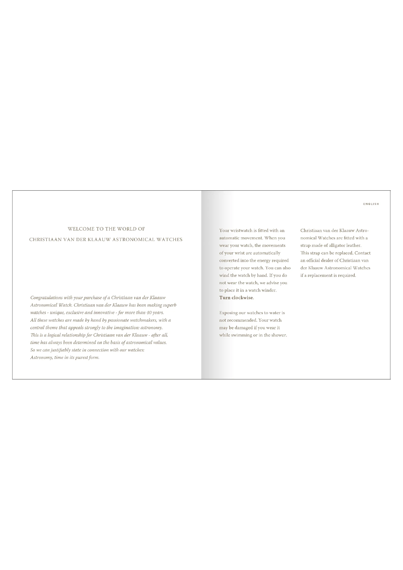0 1 2Congratulations with your purchase of a Christiaan van der Klaauw Astronomical Watch. Christiaan van der Klaauw has been making superb watches - unique, exclusive and innovative - for more than 40 years. All these watches are made by hand by passionate watchmakers, with a central theme that appeals strongly to the imagination: astronomy. is is a logical relationship for Christiaan van der Klaauw - after all, time has always been determined on the basis of astronomical values. So we can justiably state in connection with our watches: Astronomy, time in its purest form. Your wristwatch is tted with an automatic movement. When you wear your watch, the movements of your wrist are automatically converted into the energy required to operate your watch. You can also wind the watch by hand. If you do not wear the watch, we advise you to place it in a watch winder. Turn clockwise. Exposing our watches to water is not recommended. Your watch may be damaged if you wear it while swimming or in the shower. Christiaan van der Klaauw Astro- nomical Watches are tted with a strap made of alligator leather. is strap can be replaced. Contact an ocial dealer of Christiaan van der Klaauw Astronomical Watches if a replacement is required. ENGLISH