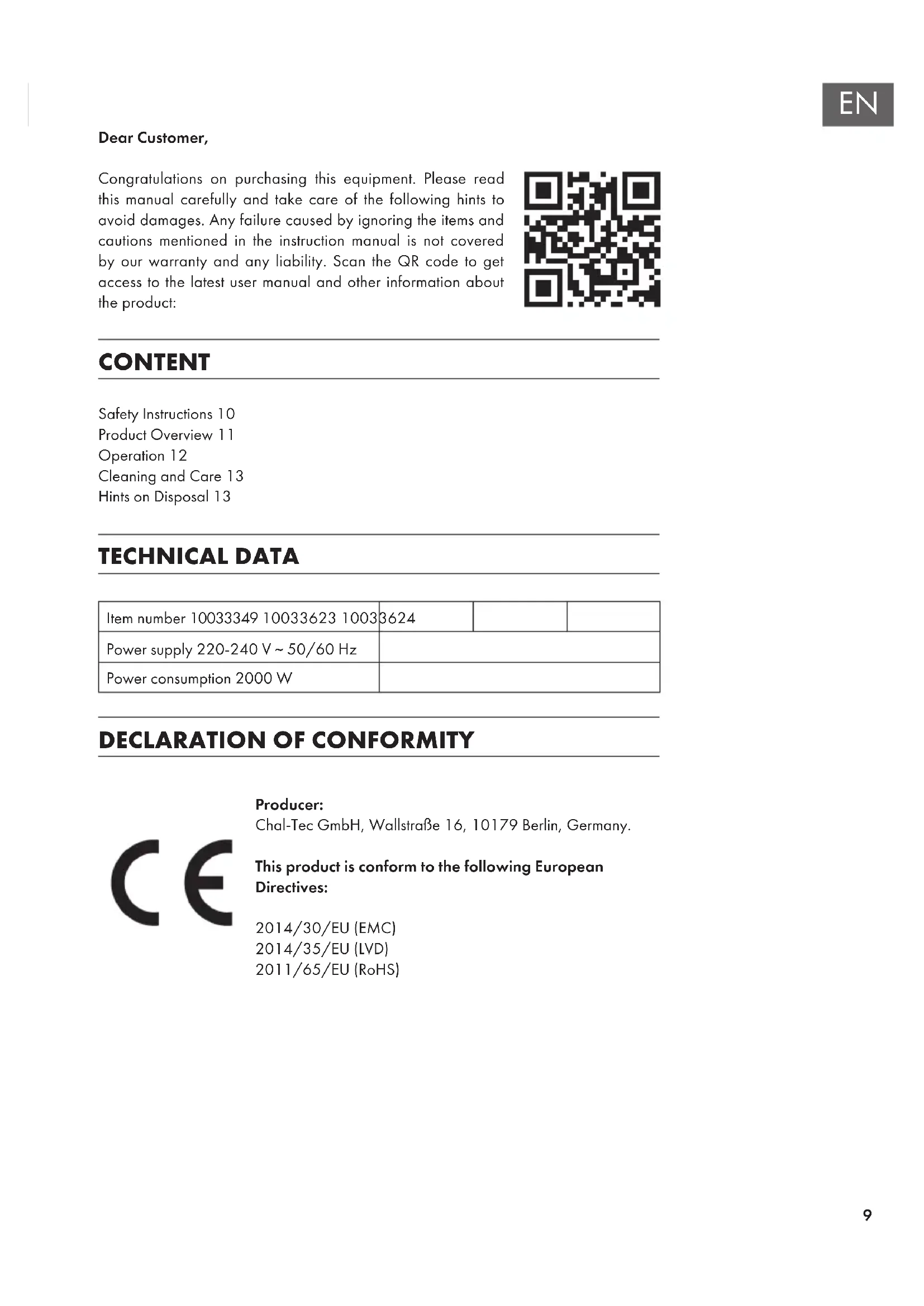 Dear Customer, Congratulations on purchasing this equipment. Please read this manual carefully and take care of the following hints to avoid damages. Any failure caused by ignoring the items and cautions mentioned in the instruction manual is not covered by our warranty and any liability. Scan the QR code to get access to the latest user manual and other information about the product: CONTENT Safety Instructions10 Product Overview11 Operation12 Cleaning and Care13 Hints on Disposal13 TECHNICAL DATA Item number 10033349 10033623 10033624 Power supply 220-240 V ~ 50/60 Hz Power consumption 2000 W
