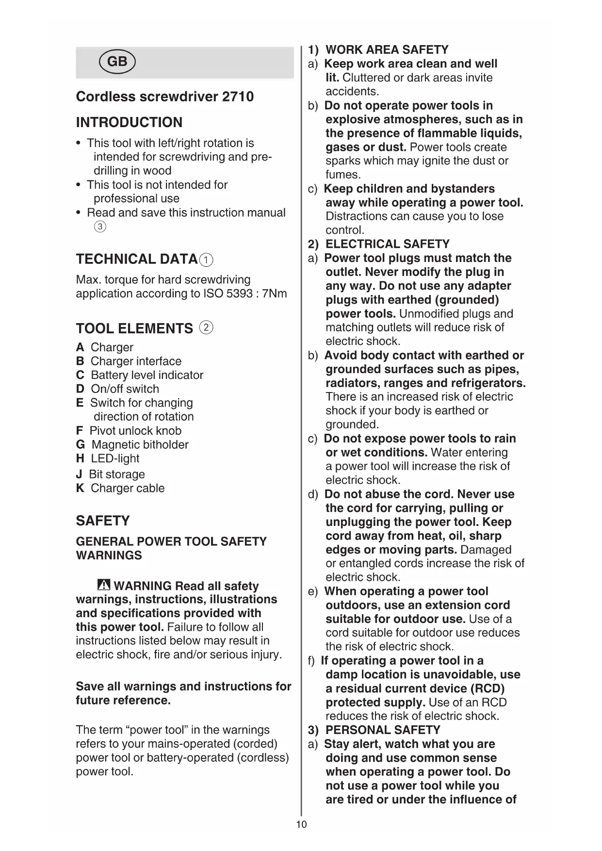A Charger B Charger interface C Battery level indicator D On/o switch E Switch for changing direction of rotation F Pivot unlock knob G Magnetic bitholder H LED-light J Bit storage K Charger cable SAFETY