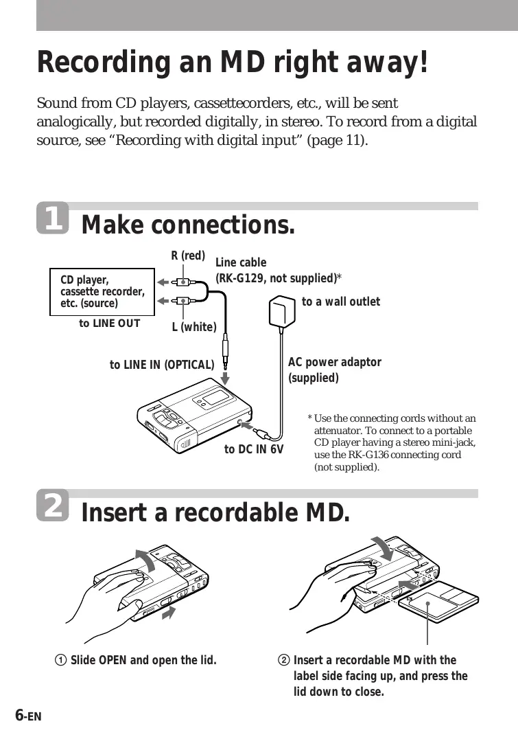 Two ways of connecting to a sound source The input jack of this recorder works as both digital and analog input jacks. Connect the recorder to a CD player or a cassette recorder using either digital input or analog input. To record, see “Recording with digital input” (page 11) to record using digital input, and “Recording an MD right away!” (page 6) to record using analog input.