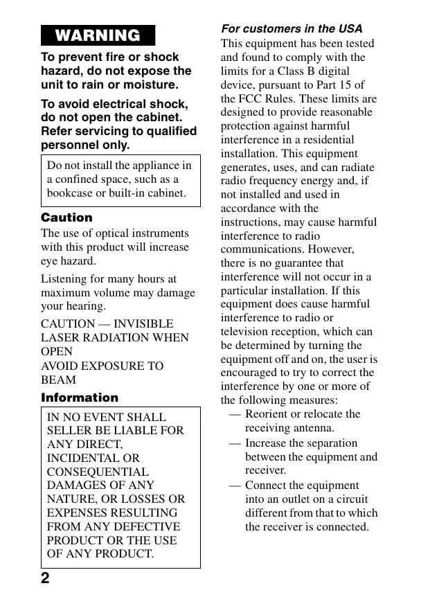 WARNING To prevent fire or shock hazard, do not expose the unit to rain or moisture. To avoid electrical shock, do not open the cabinet. Refer servicing to qualified personnel only. Do not install the appliance in a confined space, such as a bookcase or built-in cabinet. Caution The use of optical instruments with this product will increase eye hazard. Listening for many hours at maximum volume may damage your hearing. CAUTION — INVISIBLE LASER RADIATION WHEN OPEN AVOID EXPOSURE TO BEAM Information IN NO EVENT SHALL SELLER BE LIABLE FOR ANY DIRECT, INCIDENTAL OR CONSEQUENTIAL DAMAGES OF ANY NATURE, OR LOSSES OR EXPENSES RESULTING FROM ANY DEFECTIVE PRODUCT OR THE USE OF ANY PRODUCT.
