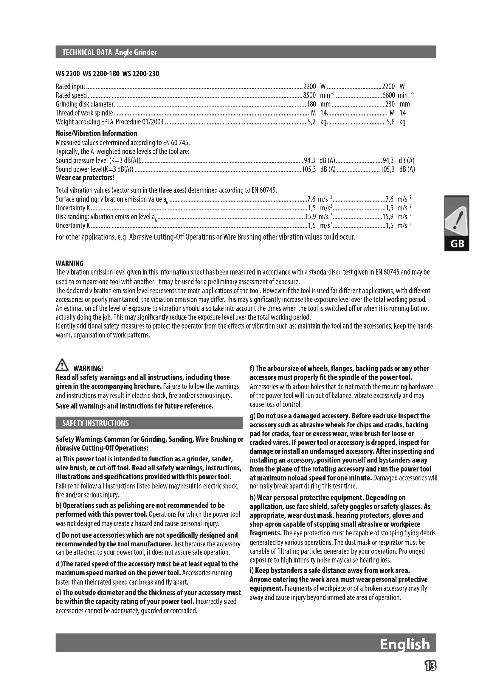 For other applications, e.g. Abrasive Cutting-O Operations or Wire Brushing other vibration values could occur. WARNING The vibration emission level given in this information sheet has been measured in accordance with a standardised test given in EN 60745 and may be used to compare one tool with another. It may be used for a preliminary assessment of exposure. The declared vibration emission level represents the main applications of the tool. However if the tool is used for dierent applications, with dierent accessories or poorly maintained, the vibration emission may dier. This may signicantly increase the exposure level over the total working period. An estimation of the level of exposure to vibration should also take into account the times when the tool is switched o or when it is running but not actually doing the job. This may signicantly reduce the exposure level over the total working period. Identify additional safety measures to protect the operator from the eects of vibration such as: maintain the tool and the accessories, keep the hands warm, organisation of work patterns. WARNING! Read all safety warnings and all instructions, including those given in the accompanying brochure. Failure to follow the warnings and instructions may result in electric shock, re and/or serious injury. Save all warnings and instructions for future reference. SAFETY INSTRUCTIONS Safety Warnings Common for Grinding, Sanding, Wire Brushing or Abrasive Cutting-O Operations: a) This power tool is intended to function as a grinder, sander, wire brush, or cut-o tool. Read all safety warnings, instructions, illustrations and specications provided with this power tool. Failure to follow all instructions listed below may result in electric shock, re and/or serious injury. b) Operations such as polishing are not recommended to be performed with this power tool. Operations for which the power tool was not designed may create a hazard and cause personal injury. c) Do not use accessories which are not specically designed and recommended by the tool manufacturer. Just because the accessory can be attached to your power tool, it does not assure safe operation. d )The rated speed of the accessory must be at least equal to the maximum speed marked on the power tool. Accessories running faster than their rated speed can break and y apart. e) The outside diameter and the thickness of your accessory must be within the capacity rating of your power tool. Incorrectly sized accessories cannot be adequately guarded or controlled. f) The arbour size of wheels, anges, backing pads or any other accessory must properly t the spindle of the power tool. Accessories with arbour holes that do not match the mounting hardware of the power tool will run out of balance, vibrate excessively and may cause loss of control. g) Do not use a damaged accessory. Before each use inspect the accessory such as abrasive wheels for chips and cracks, backing pad for cracks, tear or excess wear, wire brush for loose or cracked wires. If power tool or accessory is dropped, inspect for damage or install an undamaged accessory. After inspecting and installing an accessory, position yourself and bystanders away from the plane of the rotating accessory and run the power tool at maximum noload speed for one minute. Damaged accessories will normally break apart during this test time. h) Wear personal protective equipment. Depending on application, use face shield, safety goggles or safety glasses. As appropriate, wear dust mask, hearing protectors, gloves and shop apron capable of stopping small abrasive or workpiece fragments. The eye protection must be capable of stopping ying debris generated by various operations. The dust mask or respirator must be capable of ltrating particles generated by your operation. Prolonged exposure to high intensity noise may cause hearing loss.