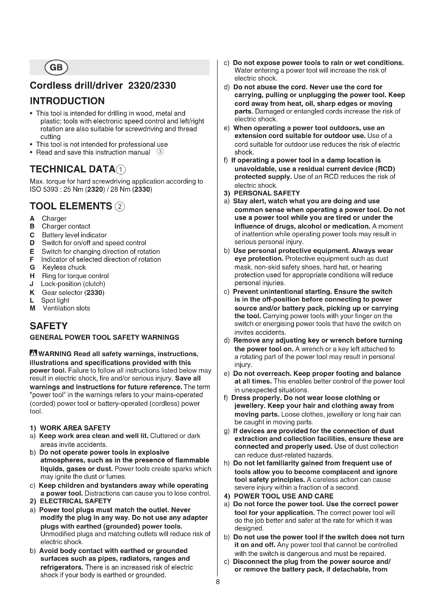 A Charger B Charger contact C Battery level indicator D Switch for on/o and speed control E Switch for changing direction of rotation F Indicator of selected direction of rotation G Keyless chuck H Ring for torque control J Lock-position (clutch) K Gear selector (2330) L Spot light M Ventilation slots SAFETY