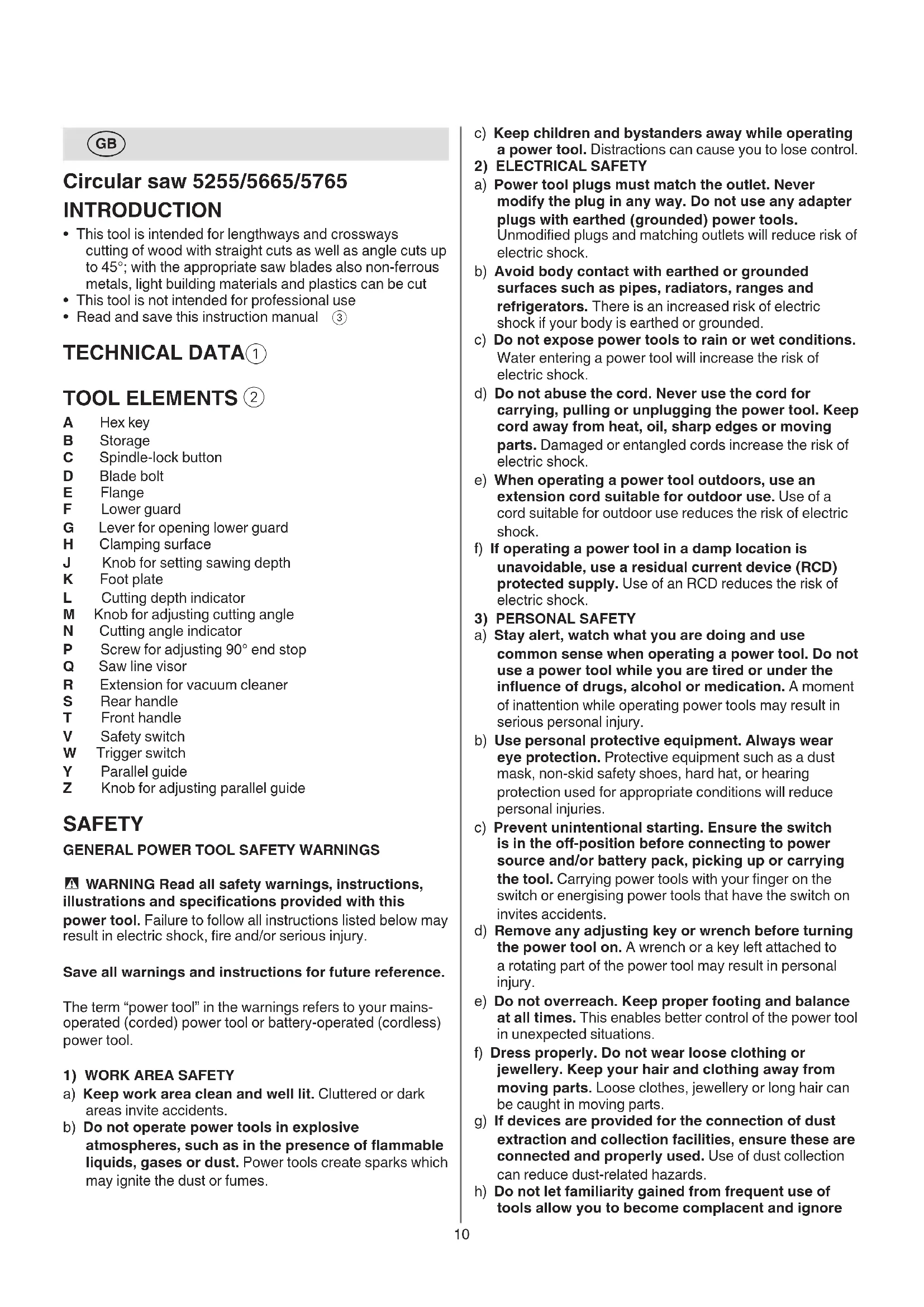 A Hex key B Storage C Spindle-lock button D Blade bolt E Flange F Lower guard G Lever for opening lower guard H Clamping surface J Knob for setting sawing depth K Foot plate L Cutting depth indicator M Knob for adjusting cutting angle N Cutting angle indicator P Screw for adjusting 90° end stop Q Saw line visor R Extension for vacuum cleaner S Rear handle T Front handle V Safety switch W Trigger switch Y Parallel guide Z Knob for adjusting parallel guide SAFETY