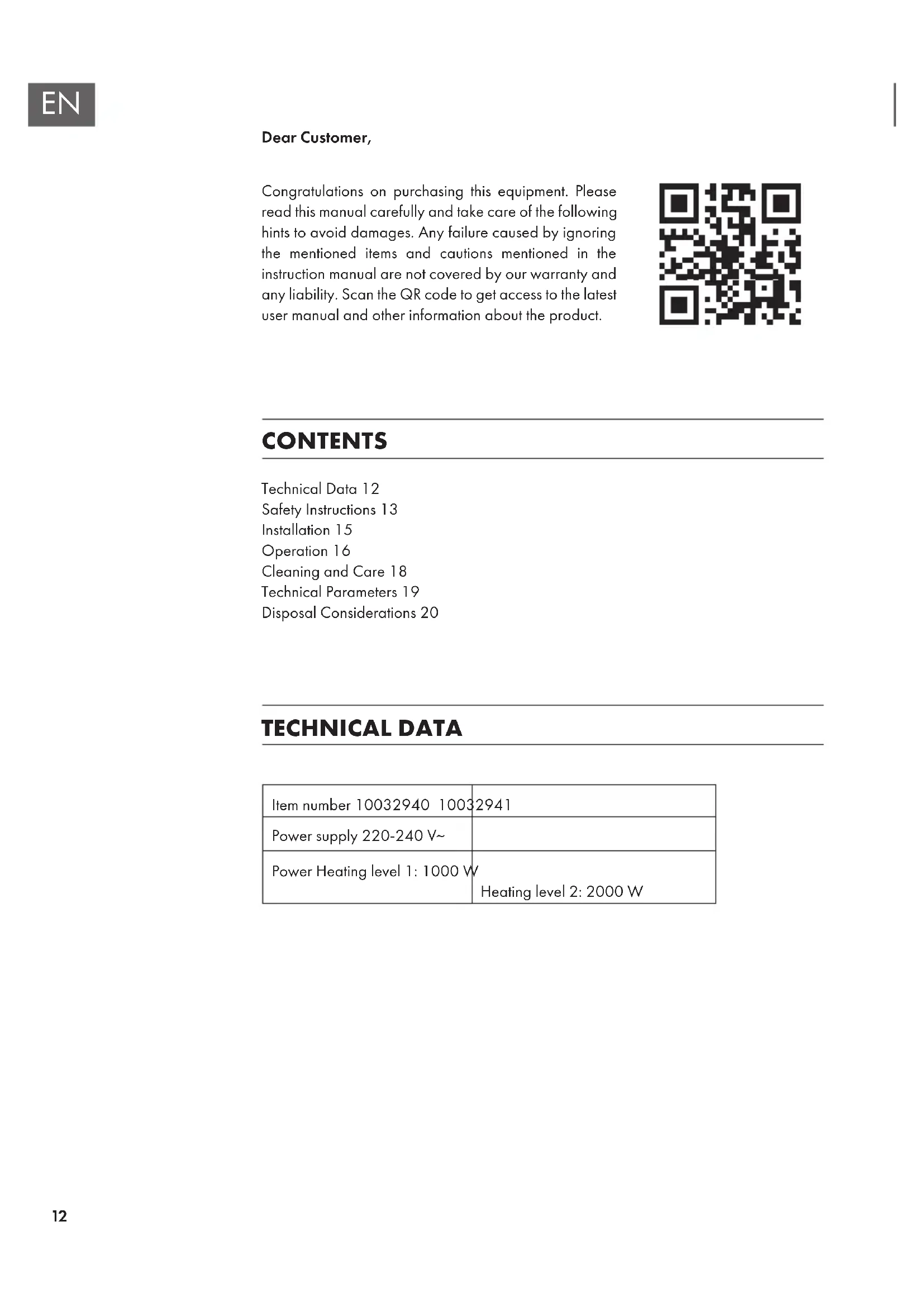 Technical Data 12 Safety Instructions 13 Installation 15 Operation 16 Cleaning and Care 18 Technical Parameters 19 Disposal Considerations 20 CONTENTS TECHNICAL DATA Item number 10032940 10032941 Power supply 220-240 V~ Power Heating level 1: 1000 W Heating level 2: 2000 W Dear Customer, Congratulations on purchasing this equipment. Please read this manual carefully and take care of the following hints to avoid damages. Any failure caused by ignoring the mentioned items and cautions mentioned in the instruction manual are not covered by our warranty and any liability. Scan the QR code to get access to the latest user manual and other information about the product.13